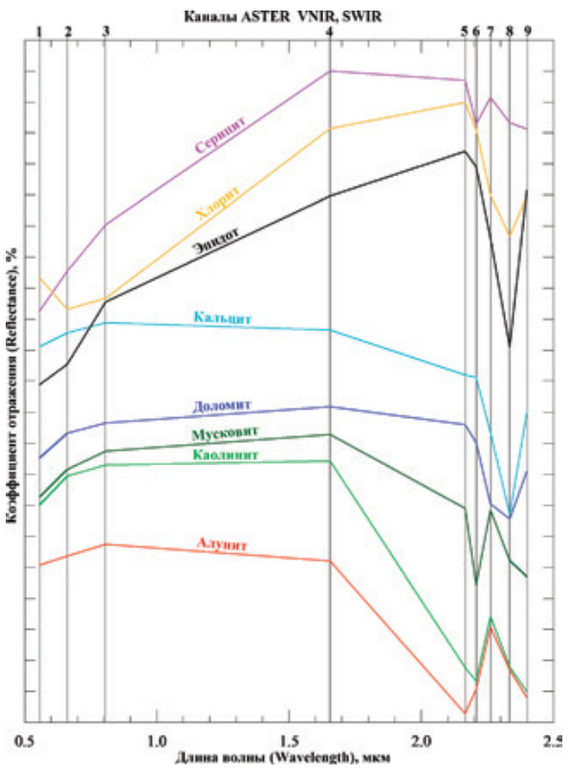 Вот пример: характерные пики отражения и поглощения для некоторых минералов относительно VNIR и SWIR каналов японского спутника ASTER.