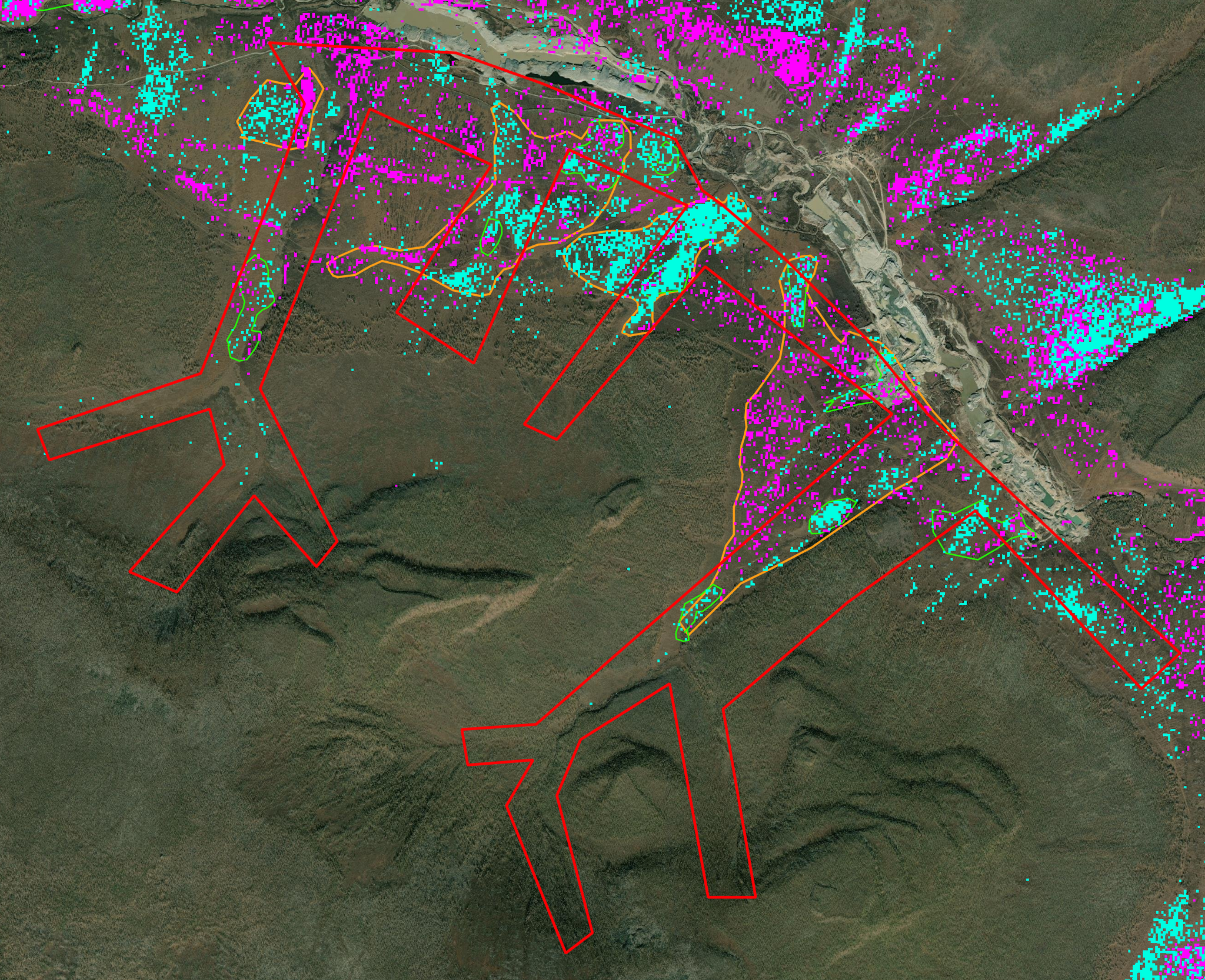 Оранжевый контуры - прогнозные источники россыпей (рудные зоны), зеленые контуры - прогнозные россыпи.