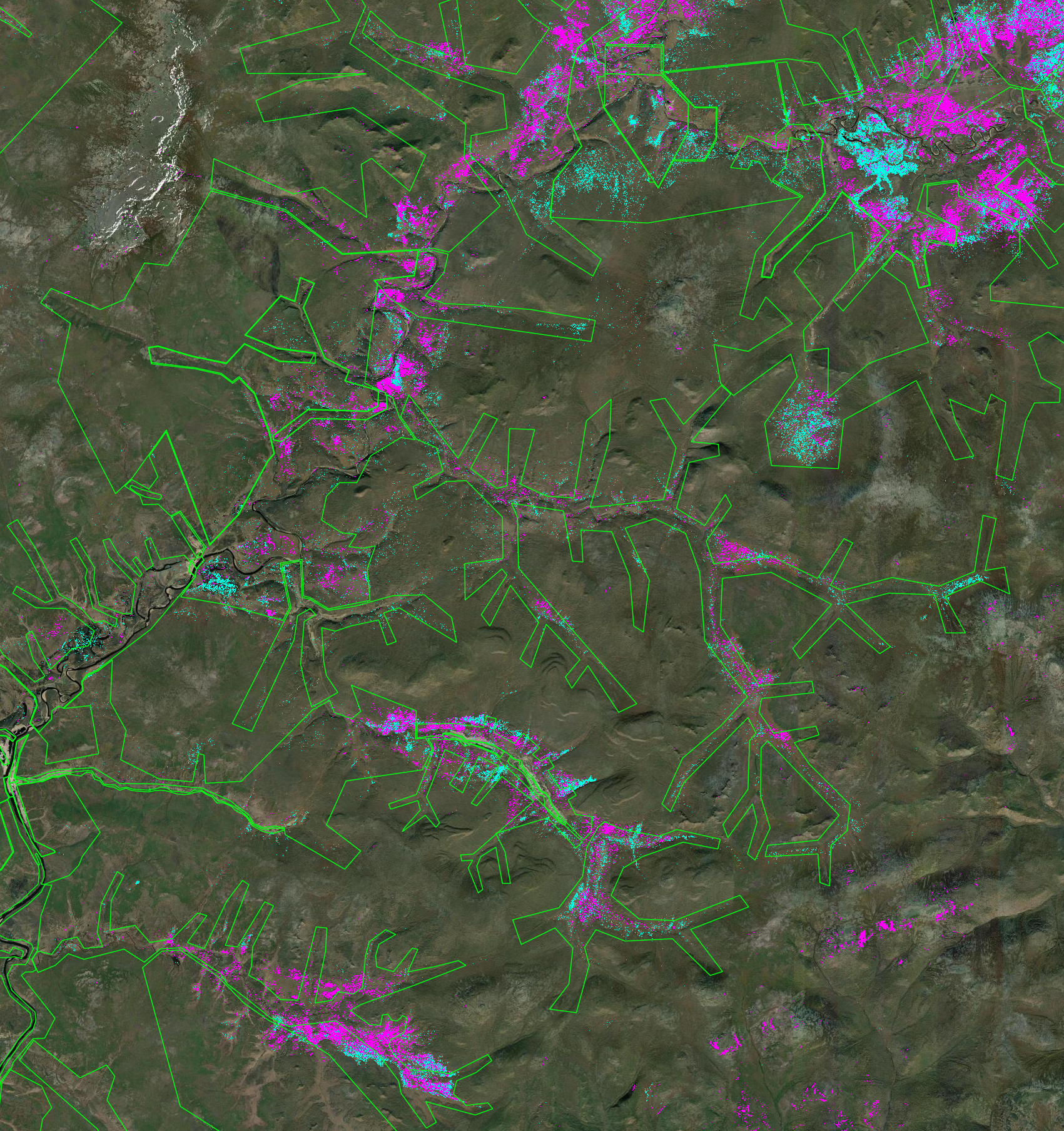 Здесь геохимические аномалии положены на карту лицензионных участков недр - видно, где в первую очередь стоит искать мелколазегающие россыпи, какие лицензии перспективны в этом плане, а какие - не очень.