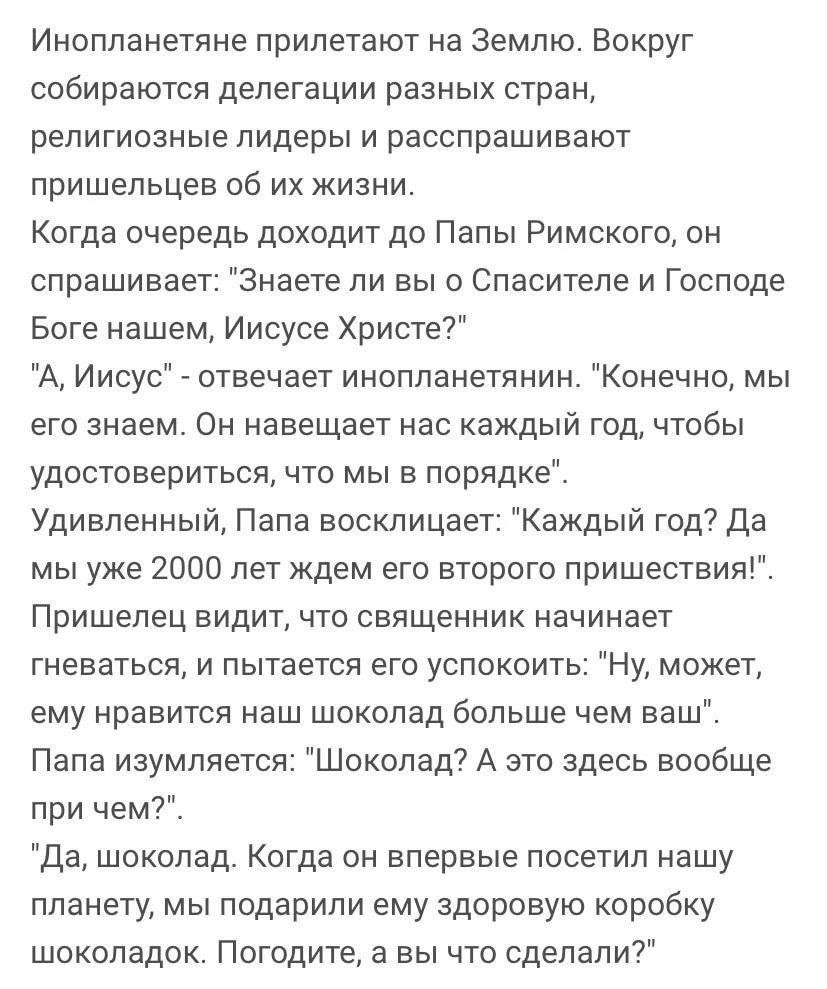 "А, Иисус" - отвечает инопланетянин. "Конечно, мы его знаем. Он навещает нас каждый год, чтобы удостовериться, что мы в порядке".