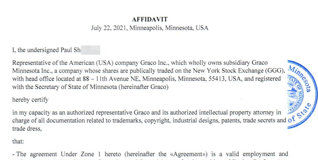 Слово умное, суть простая: это зафиксированные американским нотариусом свидетельские показания. Грубо говоря, дизайнер клянется мамой, что нарисовал дизайн сам и передал исключительное право на него компании. Как и большинство американских документов, выглядит внушительно — много страниц, много печатей, размашистые подписи. Начинается вот так: