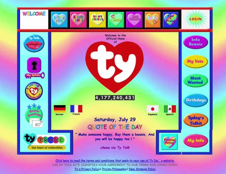 Это были небольшие, размером с ладошку, плюшевые игрушки, наполненные шариками ПВХ (что по тем временам было новинкой). Теперь их можно было садить или поставить в любой позиции. Вроде бы ничего особенного. Но Тай придумал ещё один хитрый ход. У каждого зверька было своё забавное имя, даты рождения и небольшой стишок, написанный на ярлычке. И вот это уже выделяло зверька среди остальных игрушек, придавало покупке индивидуальность. И главное — цена. Они стоили всего 5 долларов. Удивительно низко по тем временам. Любой родитель мог пойти в магазин и купить ребёнку этого плюшика, буквально на сдачу. И потом не мучиться совестью, что потратился зря. Да и дети могли легко слить часть своих карманных денег на милаху. Всё, конечно, хорошо, ну и что? Неужели только эти качества обеспечили популярность у покупателей? Нет. В начале игрушки не особо взлетали. В 1993 году вся компания состояла из 14 человек, Бини производились небольшими партиями и Тай распределял их не по крупным сетям, а по мелким магазинчикам. Многие продавцы отказывались от них, но у Тая в запасе был ещё один хитрый план. Бини начали выходить сериями.