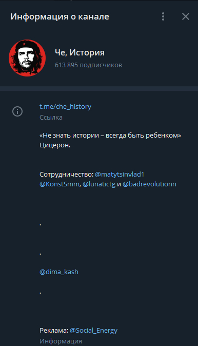 Скрин телеграм-канала и пруф на рекламу: https://t.me/che_history/18591