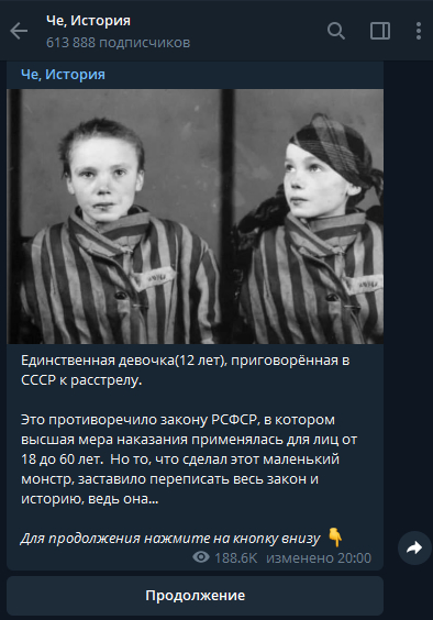 Просматривая новости в телеге, наткнулся на рекламу, чтобы прочитать продолжение которой, нужно было перейти на канал "Че, История" и подписаться: