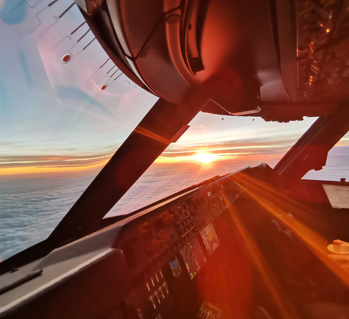 В облаках еще совсем темно. Мы набираем высоту с вертикальной 15 м/сек, небольшая турбулентеость. Вдруг небо резко проясняется, и самолет вырывается в чистое светлое небо, здесь уже встает солнце, под нас уходит ковер пушистых облаков, невероятно!