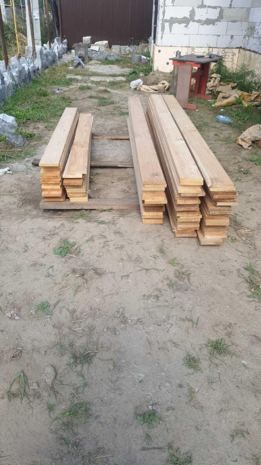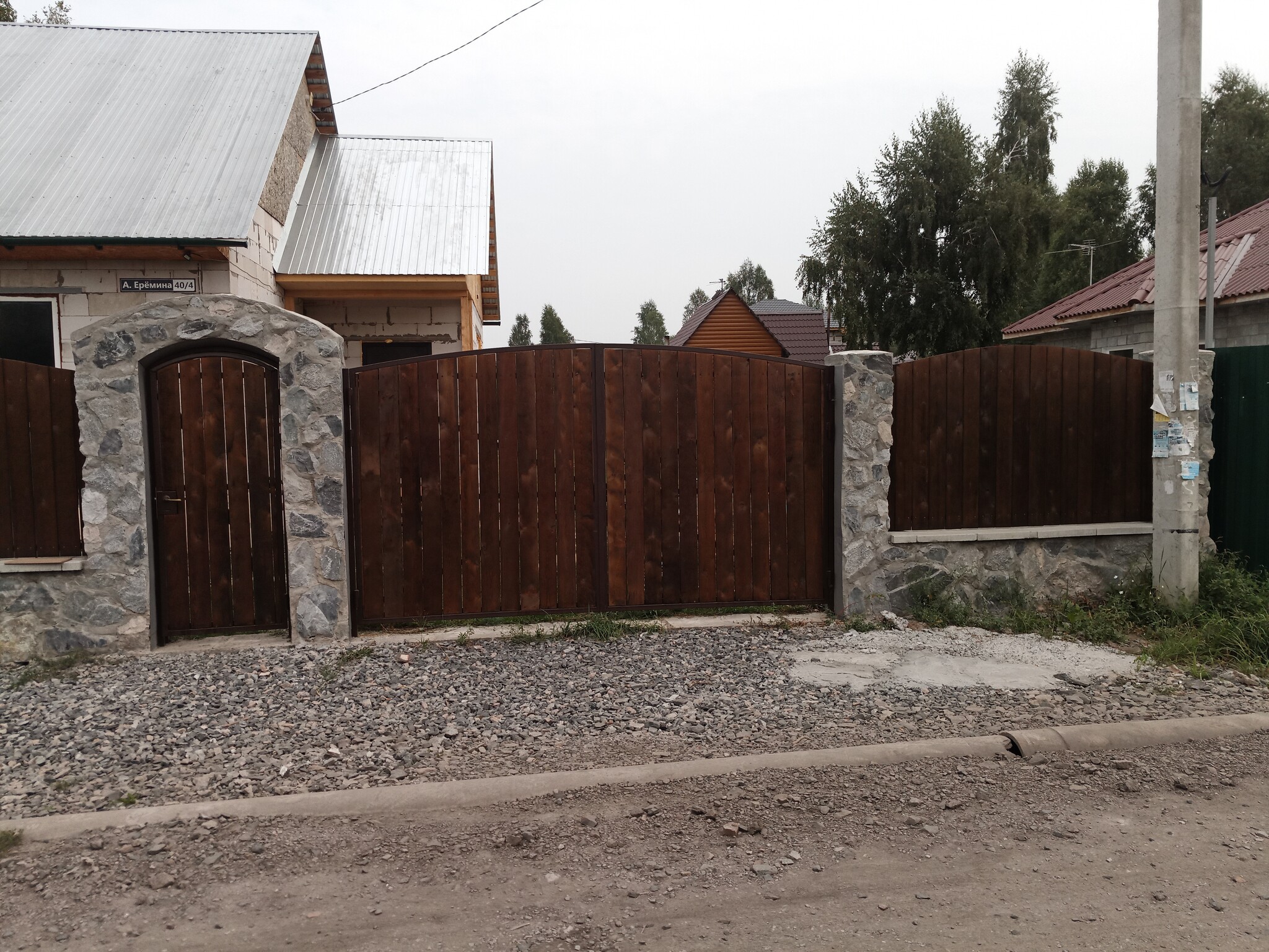 Потом берем модный планкен из лиственницы (по нашему строганная доска) , покрываем его пропиткой, и прикручиваем к воротам, калитке и пролетам. Обрезаем излишки, что бы было ровно. И готово.