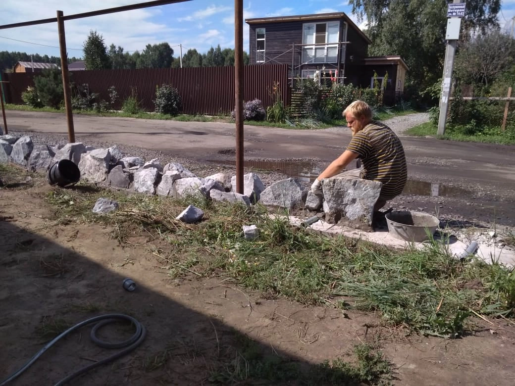Выбираем камни на первый ряд, и ставим их на раствор. С лицевой и внутренней стороны забора.