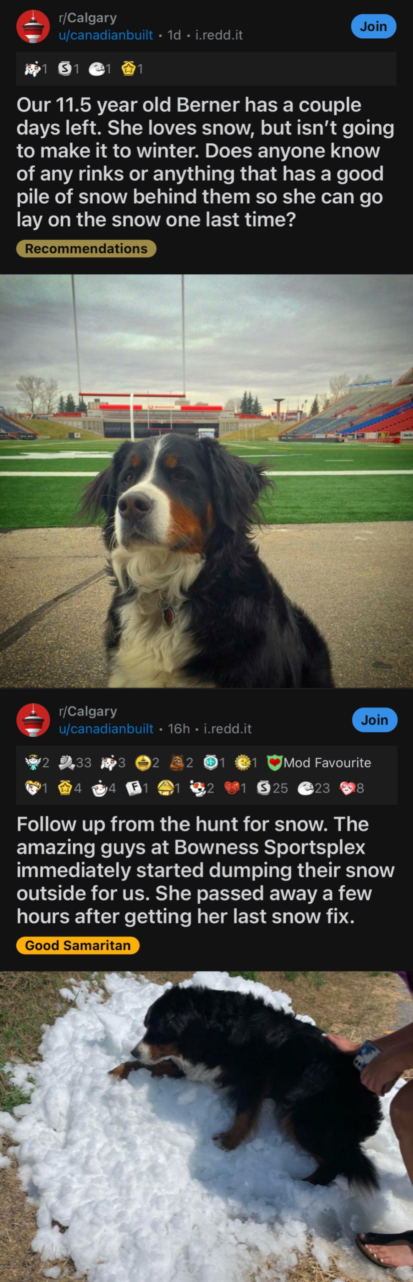 Нашей собаке породы бернский зенненхунд одиннадцать с половиной лет и она проживет еще лишь пару дней. Она обожает снег, но до зимы не протянет. Кто-нибудь знает какой-то каток или другое заведение, где можно взять приличную горку снега, чтобы она могла в последний раз на ней полежать?