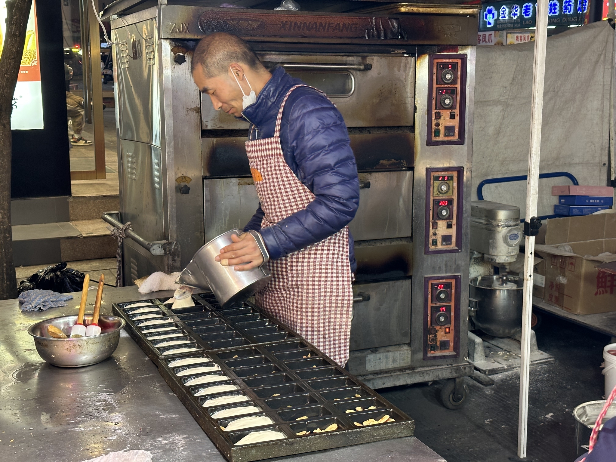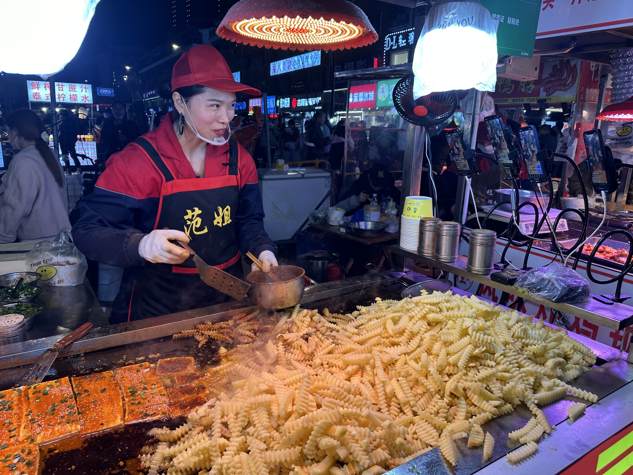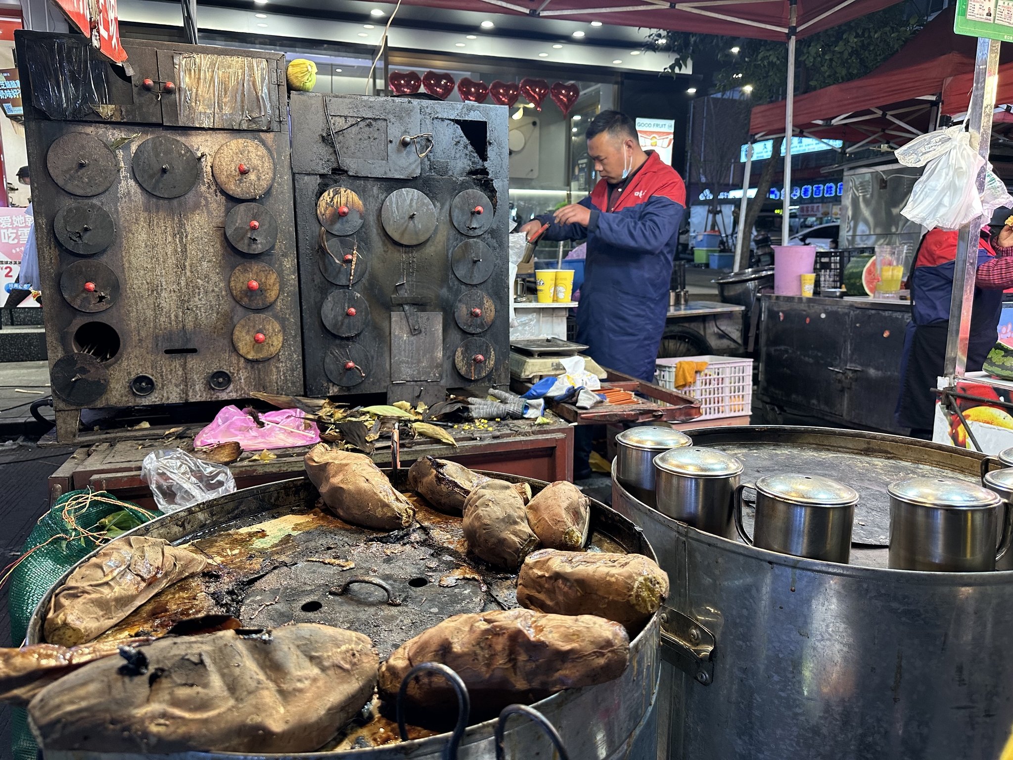 Днем это обычная улица. Вечером, часов так в восемь, продавцы выкатывают свои телеги, расставляют их в ряды, подключают газовые баллоны, зажигают печи, достают вок сковородки и начинают ЖАРИТЬ.