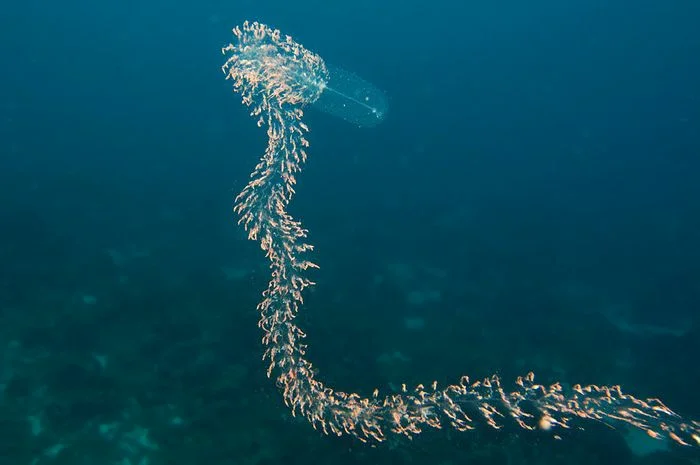 Нет, это не гигантский червь-убийца, это просто огромная колония сальп. Каждая особь длиной меньше сантиметра.