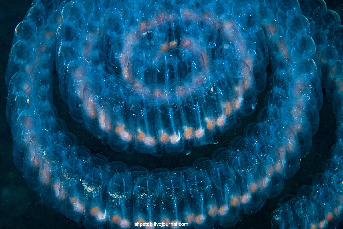 Сложно? Ха-ха, это были только цветочки! Гугля сальп, вы обязательно наткнётесь на непонятные ленточки, похожие на браслет из бусин. Так вот, это тоже сальпы, но относятся они к бочёночникам. И у них всё закручено сложнее, чем второй сезон Санта-Барбары.