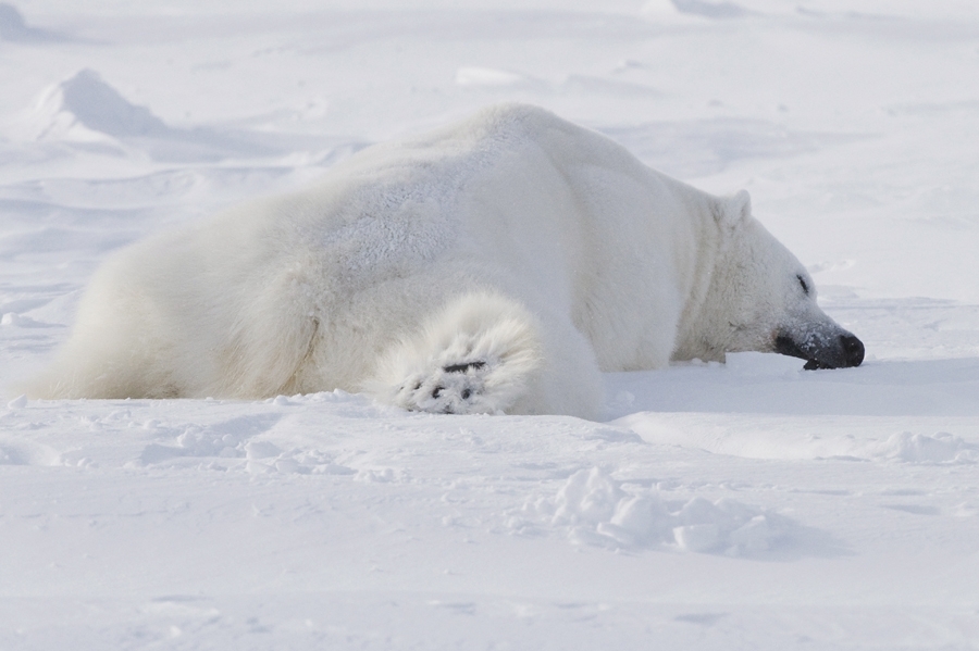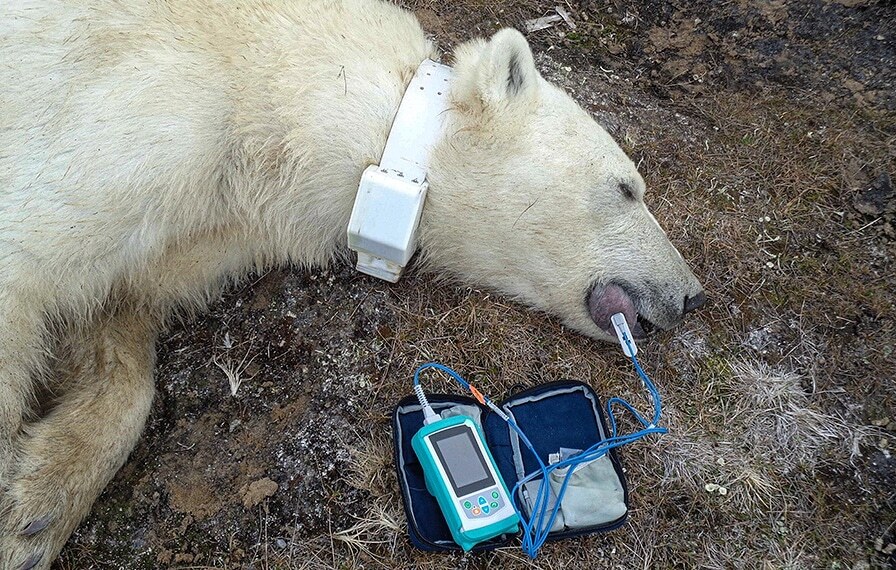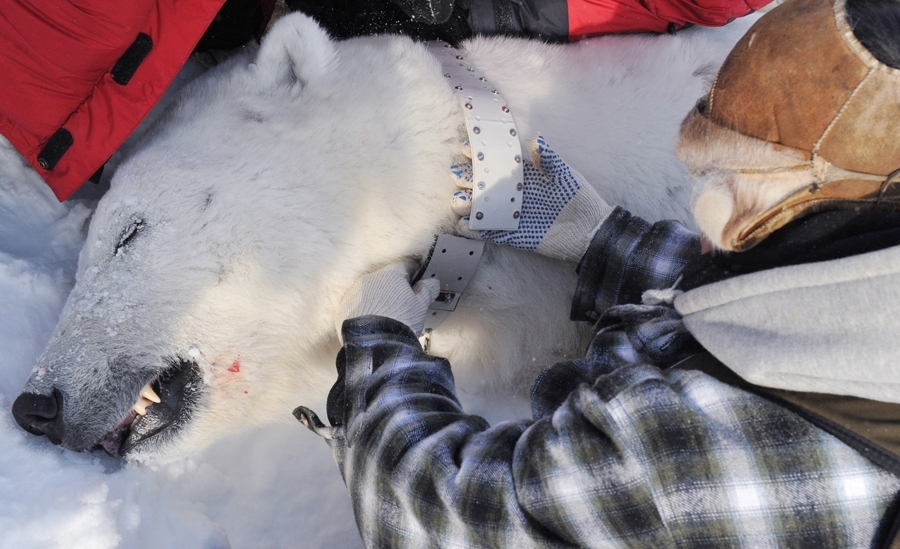 Учёные смело подходят к медведю, но за ними всё равно тянется адреналиновый след. Потому что взрослый белый медведь — это не только шестьсот килограммов научных данных, но и ловко натыканные когти и зубищи. Учёные начинают щупать медведя торопливо и безо всякого стыда. Берут у него кровь, слюну, шерсть, жир, какашечку, запихивают ему ватку в нос. Наносят ему индивидуальный номер на внутреннюю поверхность верхней губы. На женских медведей вешают ошейник с трекером. На мужских тоже пробовали вешать, но у них шеи толще головы и ошейник сползает.