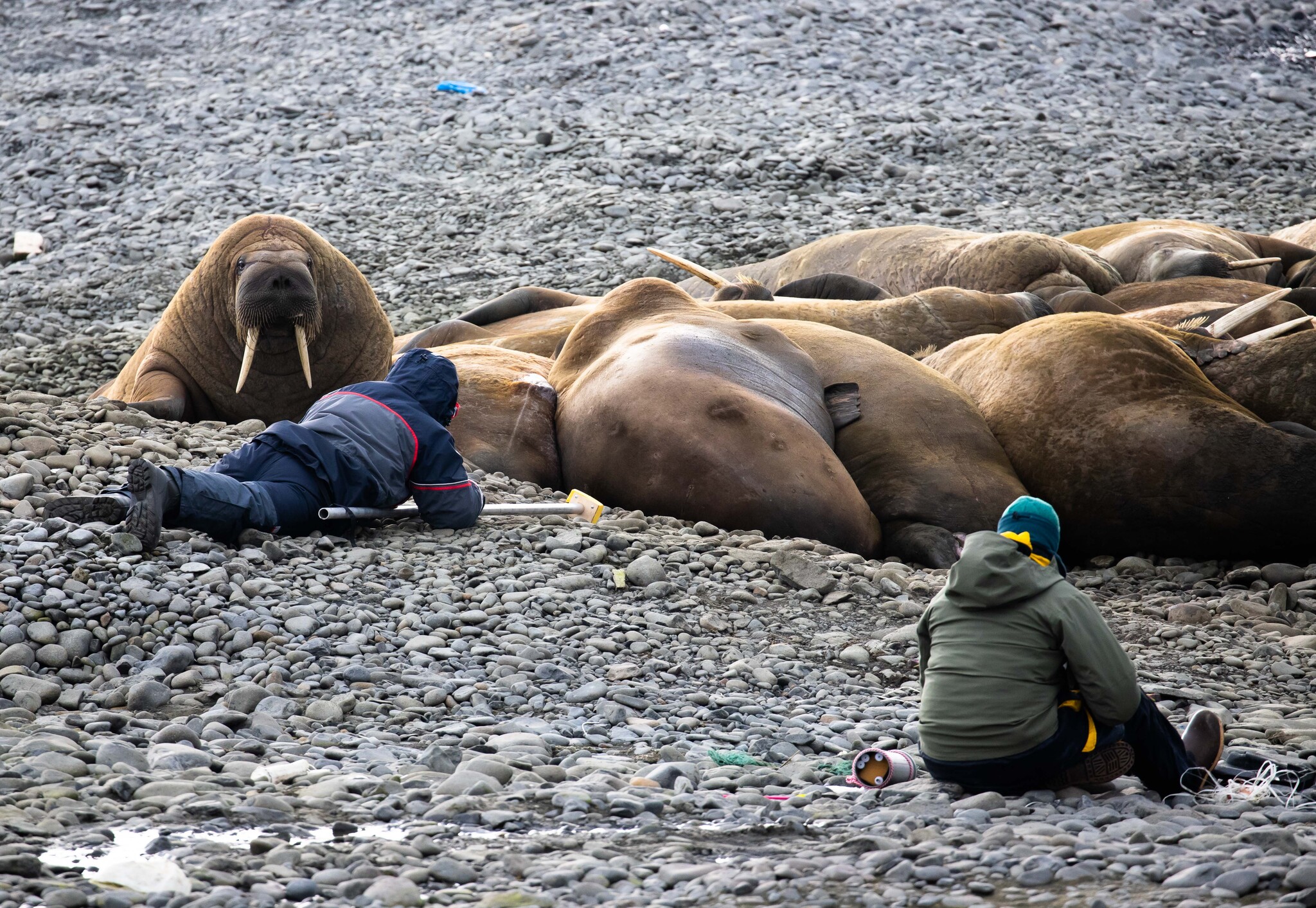 Вдоволь наскоблившись медведей, учёные отправляют за моржами. Моржей найти немного легче, потому что медведи обычно одиноко бредут, а моржи коллективно лежат. Тысячу лежащих на берегу моржей видно издалека — с высоты они выглядят как размазанный по дну скороводки бурый рис.