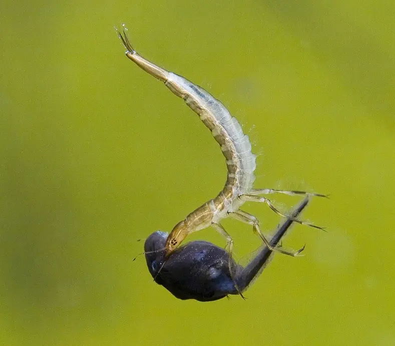 Далее уже воля Судьбы. В зависимости от температуры воды и конкретного вида личинки плавунцов могут вылупиться через 8 дней, а могут и через 40. Своим внешним видом детки заткнут за пояс монстров из фильмов ужасов и ведут себя соответствующе. Они ещё более прожорливы и агрессивны, но менее проворны. Так что добычу плавунцовая молодёжь не преследует, а ожидает в засаде. Насекомое садится на ближайший куст и выставляет свою попу над поверхностью воды. Так оно обеспечивает себя кислородом через дыхальца на брюшке.