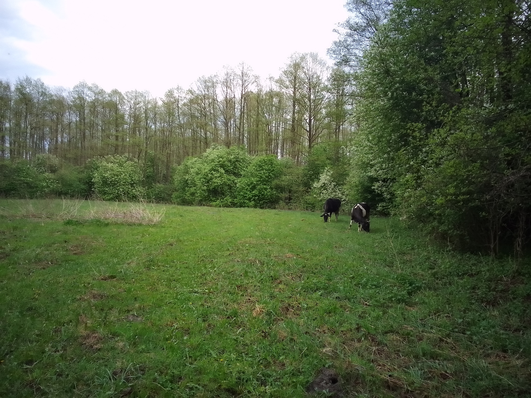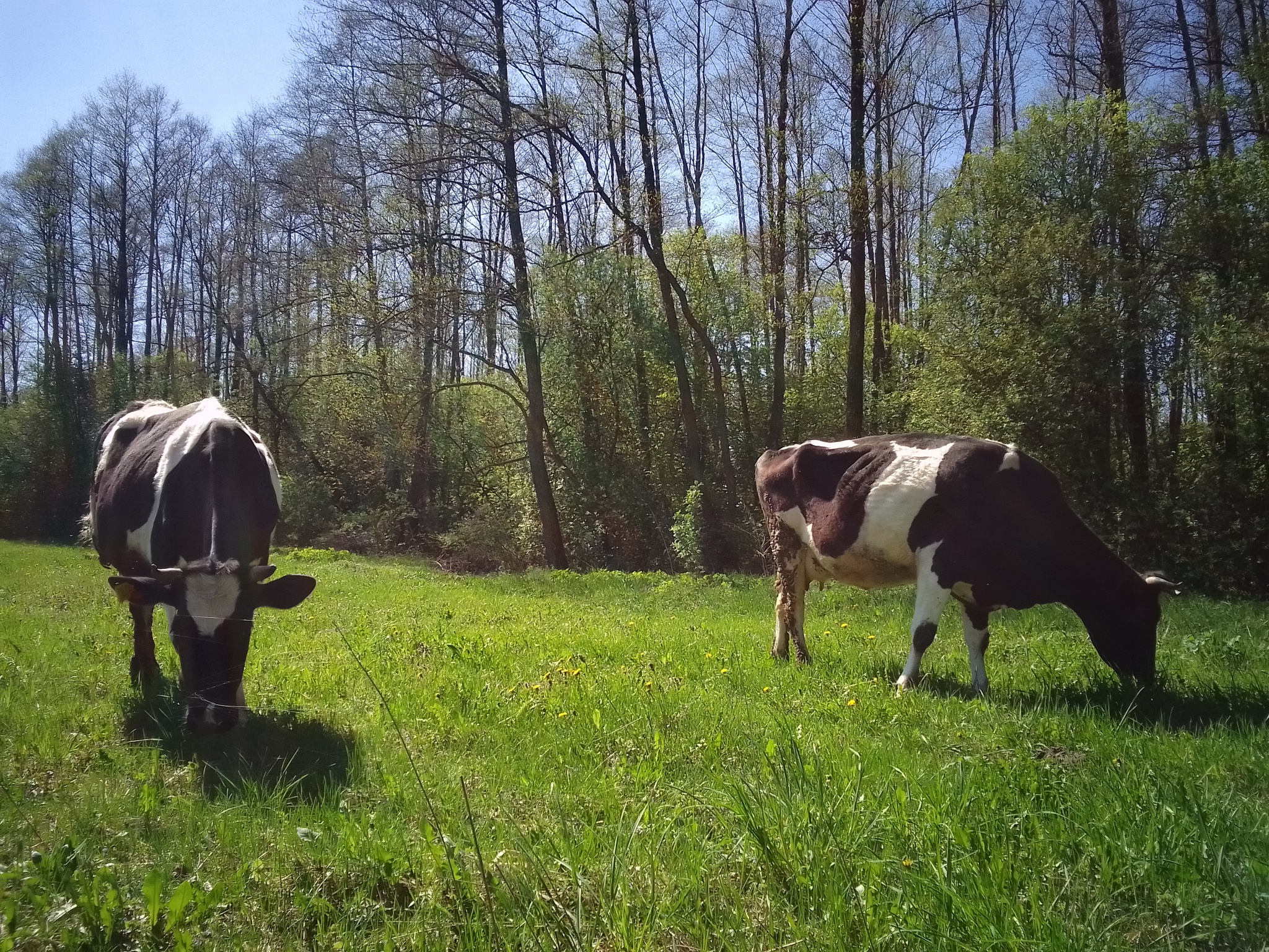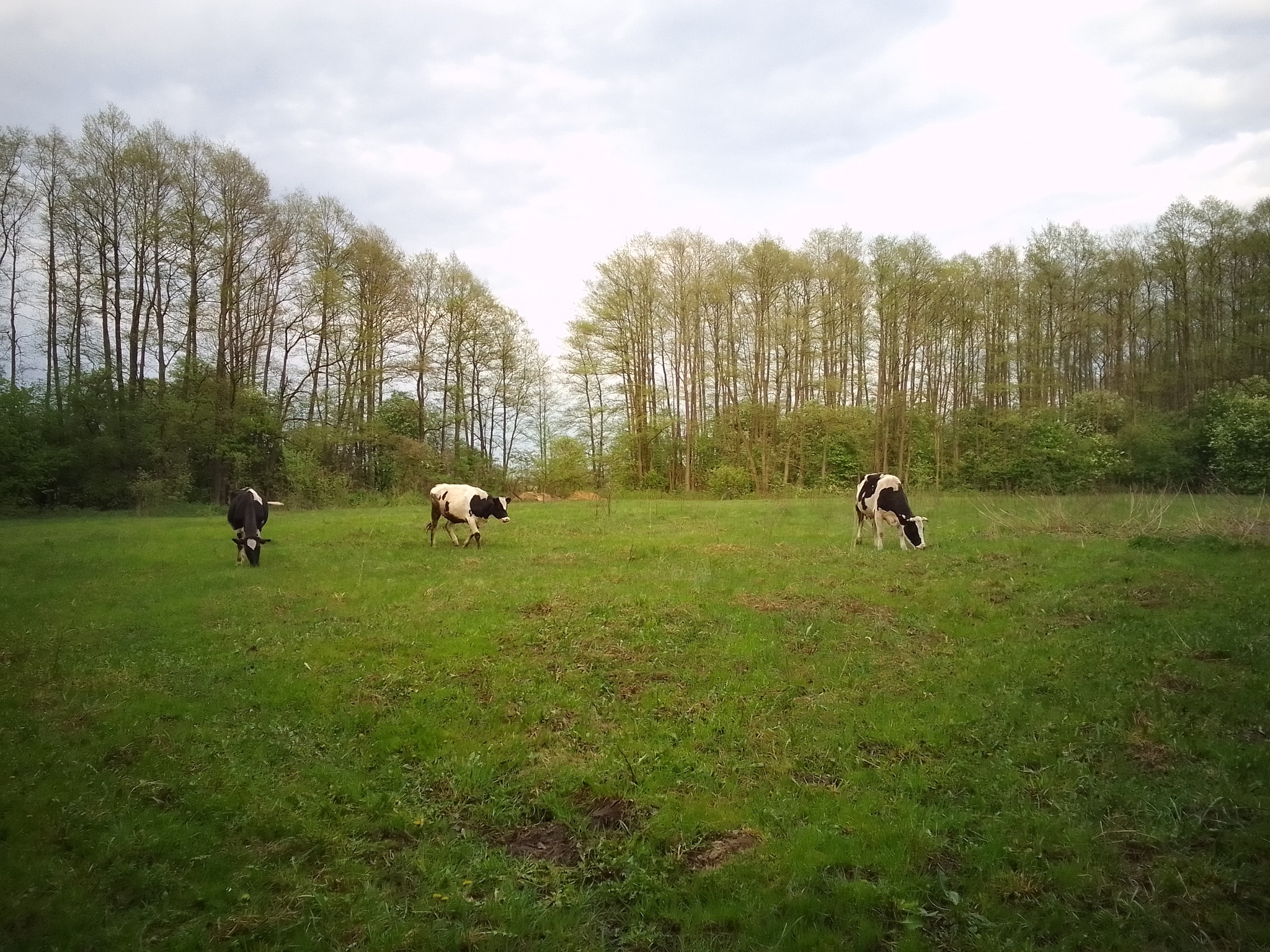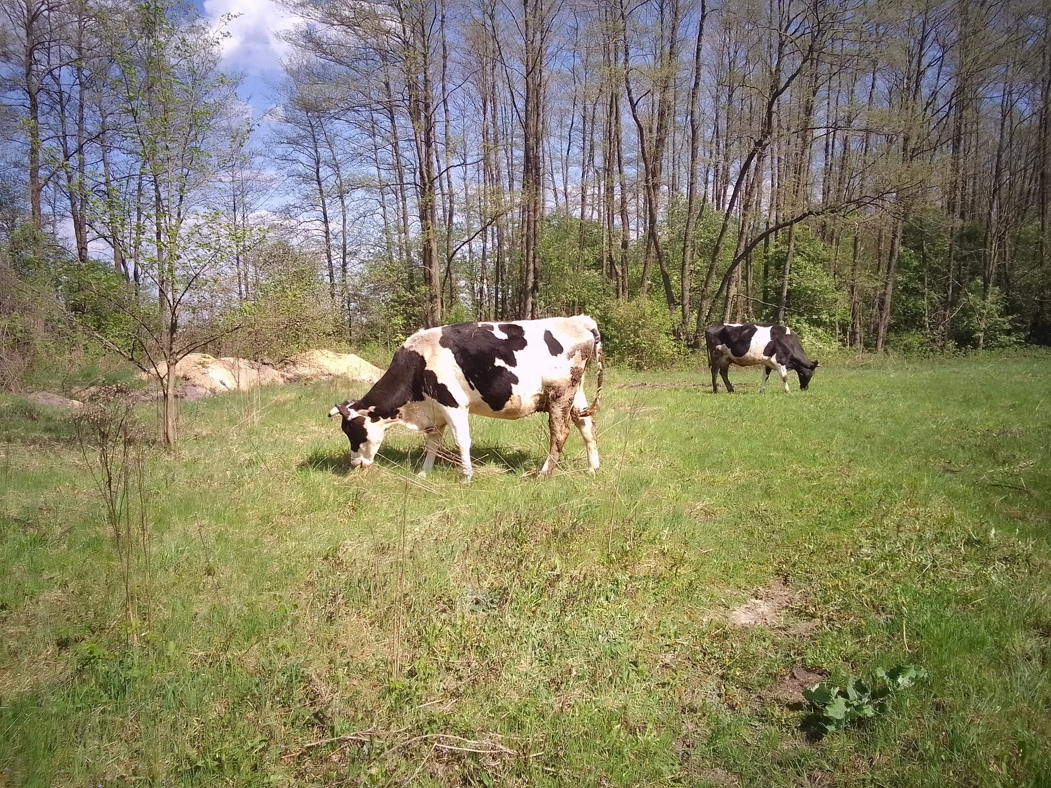 Итак, первого мая, в день труда, мы вышли на поле со столбиками и проволокой. До этого коровы уже недели две подписывались на лесной полянке возле дома и два дня - на пастбище во второй половине дня. Поэтому были набеганные и вспомнили, как есть траву. Повтыкали столбики, натянули проволоку, сходили домой за коровами, загнали их внутрь периметра и подключили электропастух. И начался цирк.