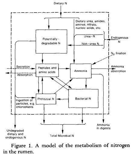 Обитатели рубца, в свою очередь, берут азот из белков растений (преимущественно из хлоропластов), из мёртвых клеток самой коровы, а заодно из белков её слюны. Немножко азота удаётся даже зафиксировать из воздуха. Для увеличения количества азота в коровах, заводчики добавляют в корм мочевину, которую всё равно будут перерабатывать симбиотические организмы.