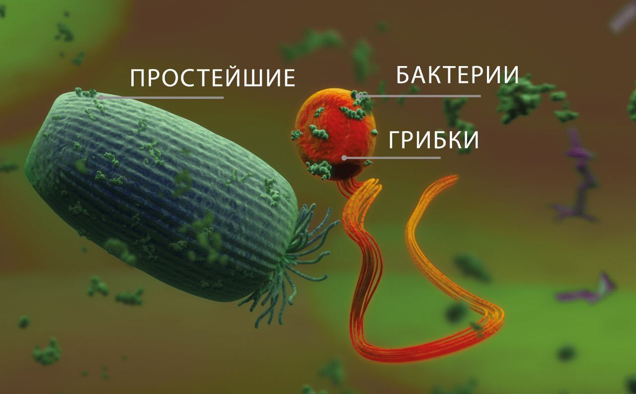 Например, есть бактерии-мусорщики, которые едят отмёршие клетки стенок рубца.