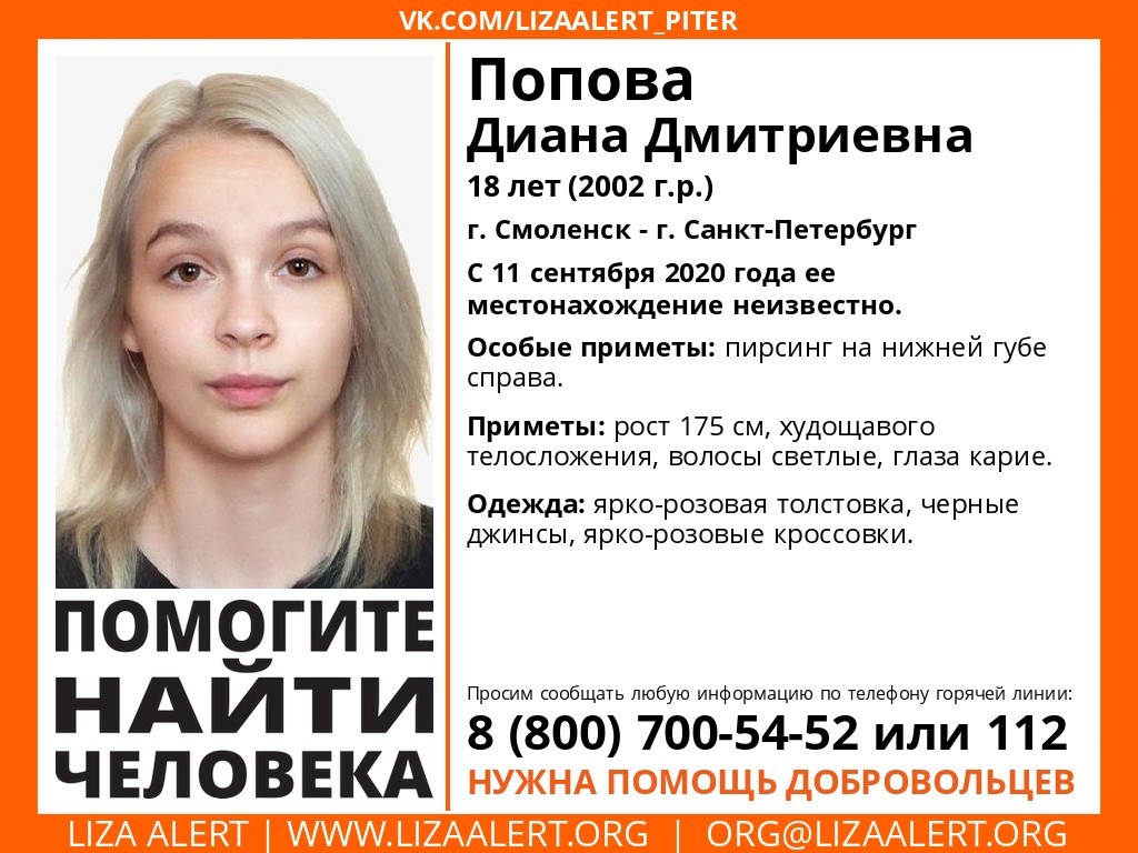Доброго времени суток! Вот уже более 9 месяцев мы ничего не знаем о нашей дочери Поповой Диане Дмитриевне, 2002 года рождения! Вот уже более 9 месяцев Вы помогаете нам искать нашу дочь! Более 9 месяцев Вы нас поддерживаете добрым словом!Более 9 месяцев мы объясняем, что мы не ругались с нашей дочерью!Более 9 месяцев мы рассказываем о том, что наша дочь доехала со своим парнем до Санкт-Петербурга (на автобусе из Смоленска до г. Псков и далее на поезде из г. Псков до СПб), 15.09.2020 года в 9:30 вышла в СПб и дальнейшая судьба ни нашей дочери ни парня нам по прежнему не известны!!?Более 9 месяцев мы живем как во сне, как будто это происходит не с нами!?!Более 9 месяцев Вы нам помогаете искать нашу дочь! (ставите лайки, делаете репосты, пересылаете и всячески распространяете информацию о ее поиске). Спасибо Вам всем кто помогал и помогает нам искать нашу дочь!!! Мы Вам бесконечно благодарны! Мы не прекращаем поиски Дианы, мы продолжаем ее искать и ждать домой! Простите нас – родителей, но мы снова обращаемся к Вам за помощью! Пожалуйста обратите внимание, может быть наша дочь проживает сейчас рядом с Вами или Вы увидите ее в общественном транспорте или где либо еще!? Пожалуйста, дайте знать нам, или сообщите в полицию, или в поисковой отряд «Лиза Алерт» Диана на сегодняшний день может находиться в любом регионе РФ. Заранее спасибо Вам огромное за помощь в поиске нашей дочери! Берегите себя и своих близких, мир Вашему дому! С бесконечной благодарностью к Вам, родители Дианы.