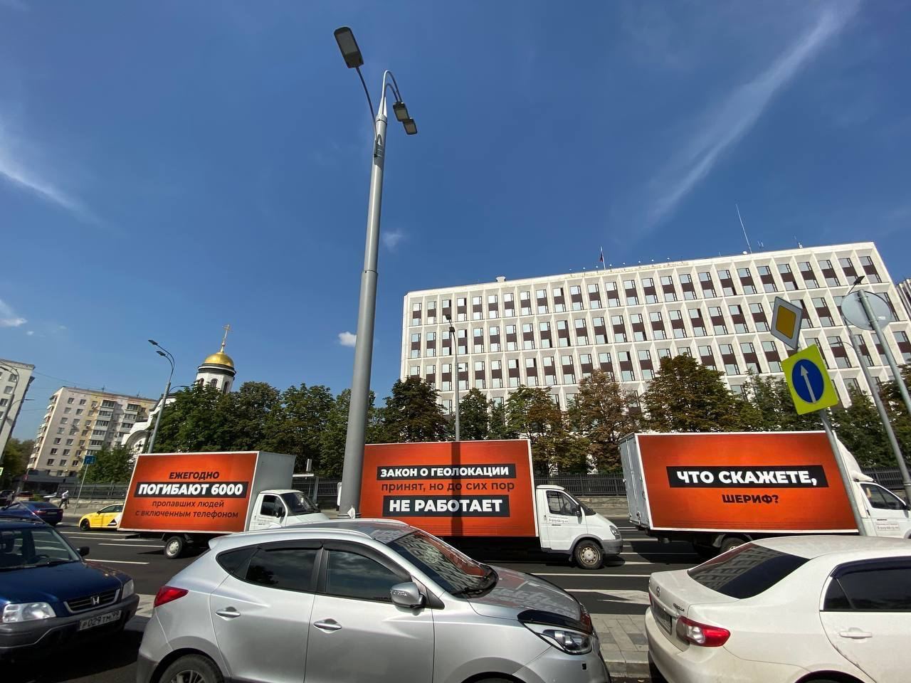 А тема толковая: куратор Центра поиска пропавших людей пригнал три тачки с транспарантами с интересными слоганами. В порядке очереди автомобилей: «Ежегодно погибают 6000 пропавших людей с включенным телефоном», «Закон о геолокации принят, но до сих пор не работает», «Что скажете, шериф?».