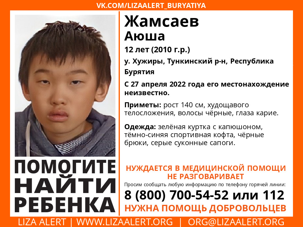 27 апреля 2022 года в улусе Хужиры Тункинского района республили Бурятия пропал 12-летний Жамсаев Аюш. Поиски пропавшего ребенка продолжаются пятые сутки. Сегодня было задействовано более 120 человек, среди которых порядка 20 человек - поисковики из отряда "ЛизаАлерт" различных областей - Бурятии, Иркутской области, из Москвы. Около 25 человек сотрудников правоохранительных органов. И неравнодушные местные жители.