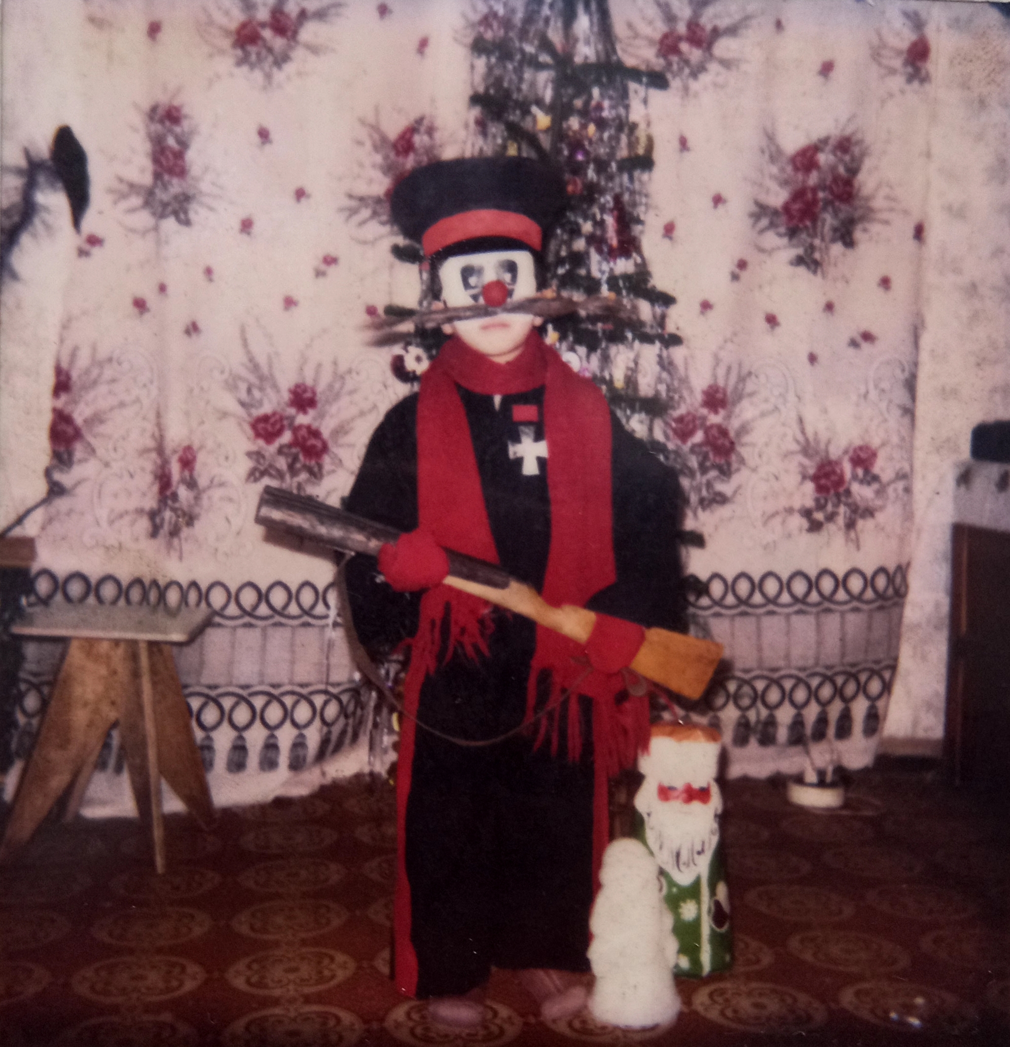Одежду сшила мама, ружье из дерева, орден-крест из какой-то жестянки, фуражка из ватмана, маска тоже ватман, нос теннисный шарик, усы соломы на проволоке, это все сделал отец.