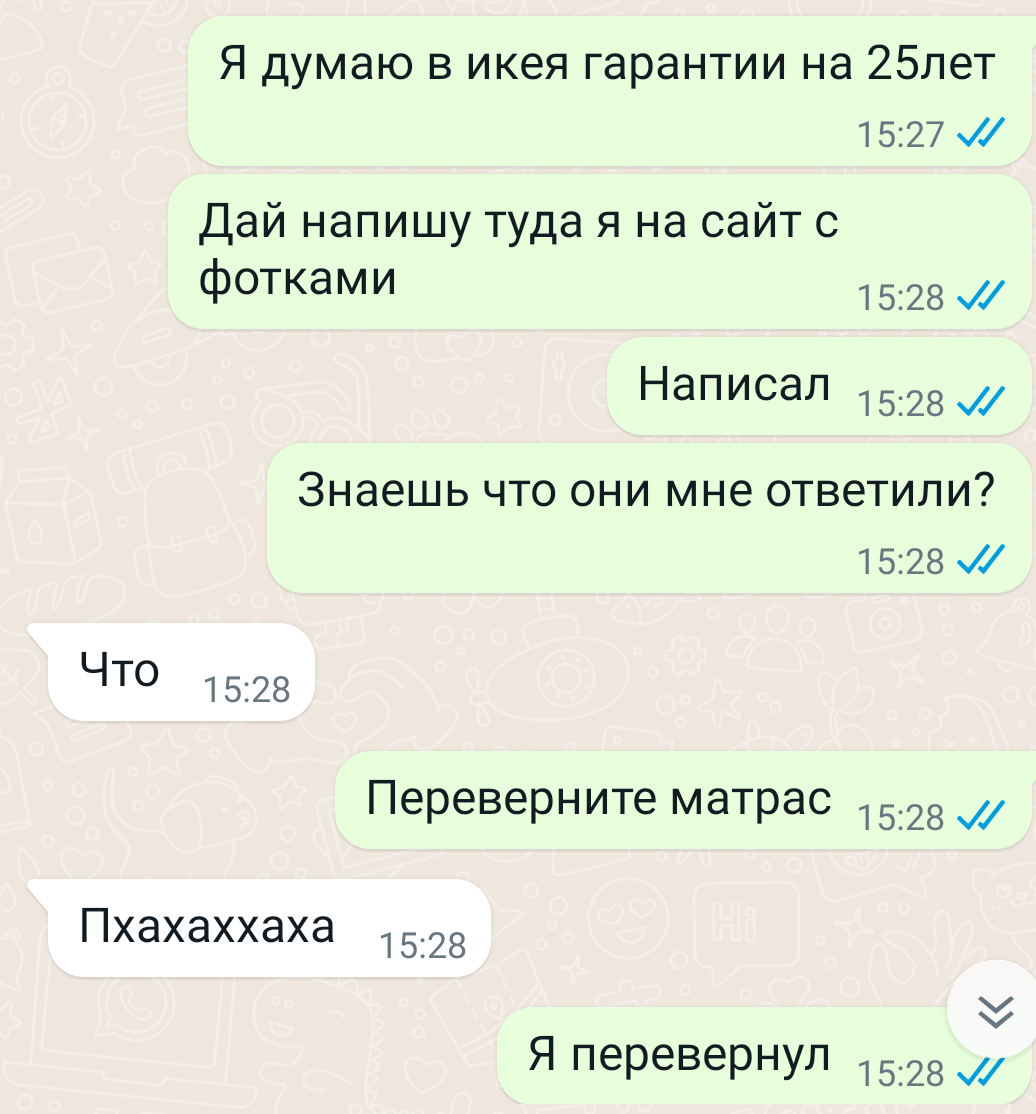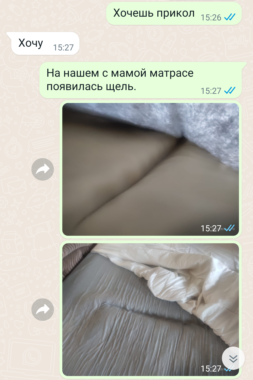 Но всё пошло не по плану. В скидке отказали по причине оторванного фирменного шильдика на старом матрасе (он сохранился, но отвалился от времени, и не держался на матрасе), за утилизацию запросили 1600. Согласились. И всё веселье началось. Привезли новый матрас, распаковали, до сих пор не могут выветрить непонятный запах. А когда увидели в соседнем дворе на мусорке свой старый матрас (узнали его по характерным повреждениям), офигели от такой фирменной "утилизации".