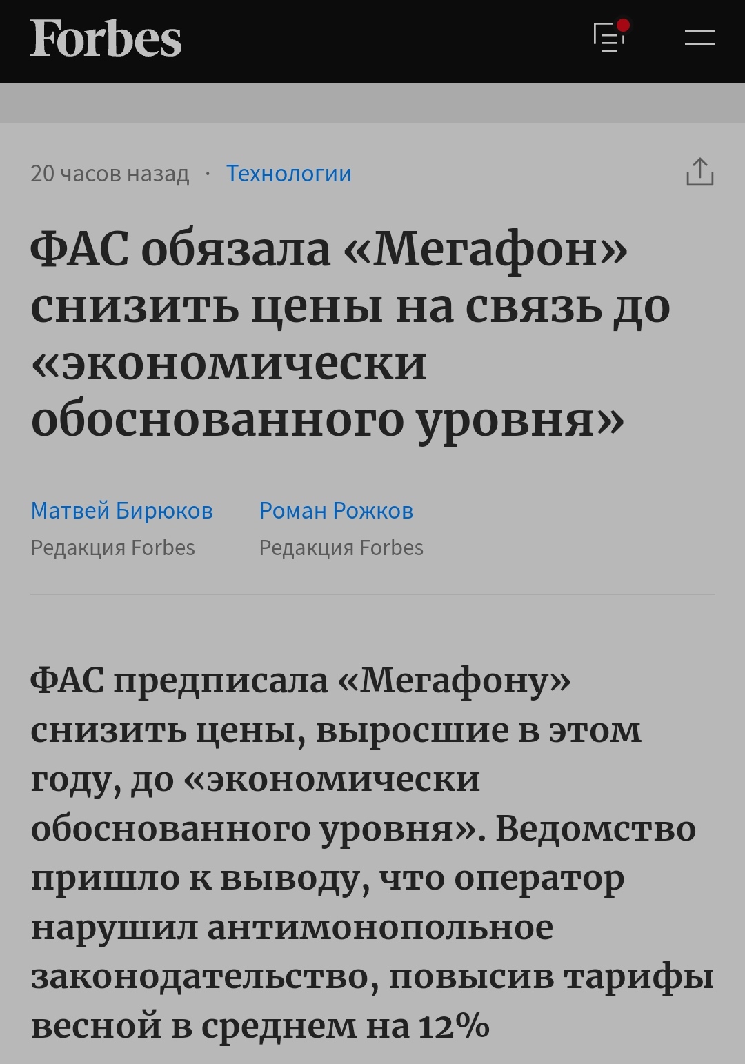 Вчера появилась замечательная новость о том, что Мегафон признали виновным в необоснованном повышении цен в начале 2022 года и ФАС обязал эти цены снизить.