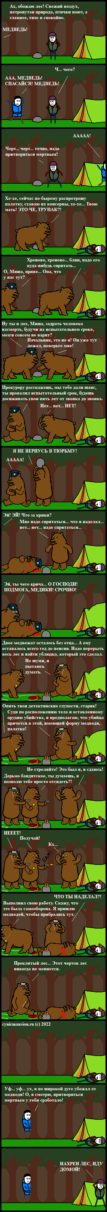 Медведь отделался тяжёлым. Отчим посмотрел ему вслед в бинокль и сказал что это совсем молодой мишка, двух-трёх лет. Только то мамки оторвался, а тут такие стрессы. Наверное он долго ходил потом к медвежьему психологу, лечил энурез и заикание. Миша, прости, я не нарочно!
