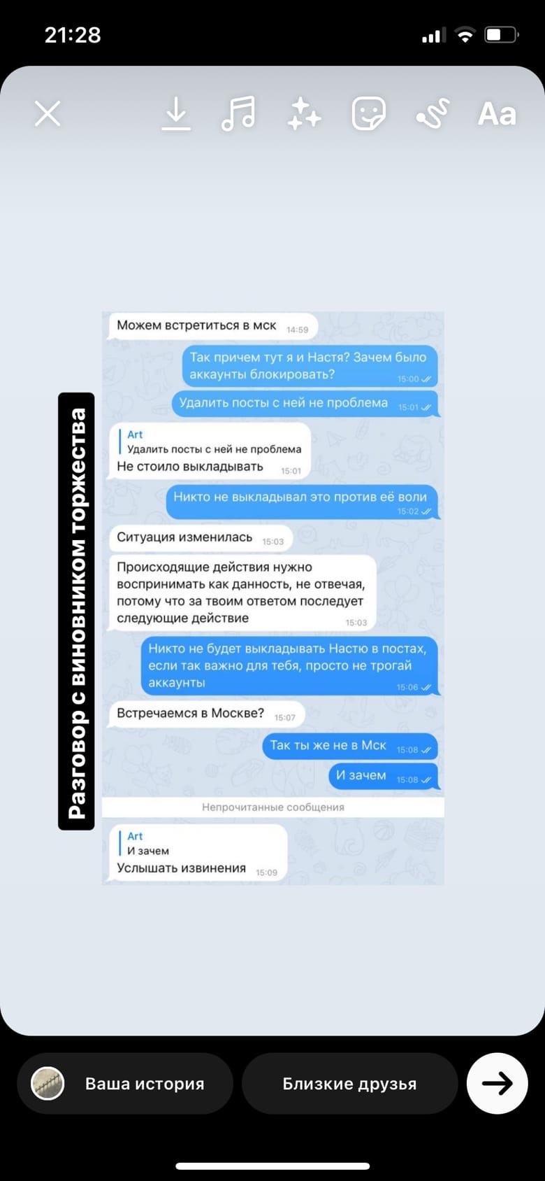 Дальше полный треш. Естественно мы написали Насте: мол, как ты так могла и обещали рассказать всю эту историю, после чего начались разные звонки от дагестанцев и ингушей с просьбами встретится и записать извинения перед Настей. Звонки от якобы желающих заказать съемку ( причем настолько палевных и тупых что сразу ясно что это развод). И он не просто заплатил им, а еще и приврал - что мы кидаем людей на съемках. В общем: не знаю что и делать с этой историей. Надеюсь вы поможете придать этой истории огласку.