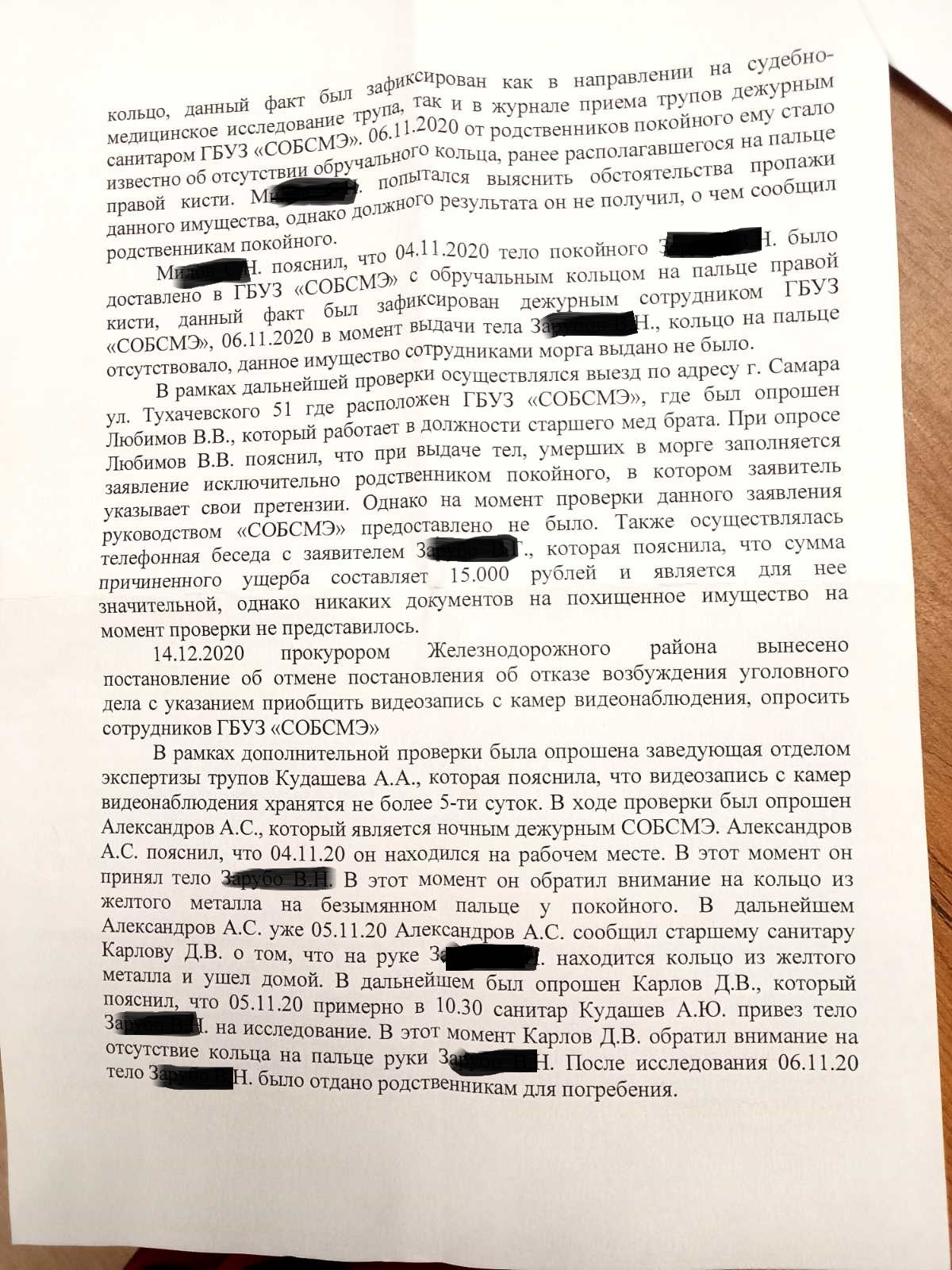 Нет, не похоронили. Нашлась в морге «крыса», которая срезала кольцо, оставив порез на пальце. Заметила я это в ритуальном зале, на прощании. Сделала фото. Было написано заявление в МВД, согласно ст.158 УК РФ «Кража» и ст. 244 УК РФ «Надругательство над телами умерших». Расследование начал участковый и практически сразу «крысу» нашел . Конечно это был санитар, который привез тело на вскрытие. Но это оказался не простой санитар, а санитар - муж заведующей отделением экспертизы трупов. Заведующая начала бить себя в грудь пяткой и утверждать, что « никто, никогда, мы приличные люди». Ага, упыри! Муж – санитар уволился, после первого визита участкового. Но на меня через третьих лиц, вышли руководители ГБУЗ «Самарское областное бюро судебно-медицинской экспертизы» и стали предлагать деньги. Чтобы я не поднимала шумихи. Я же в ответ предложила организовать мне встречу с упырем, который кольцо срезал. Уж больно хотелось плюнуть в его морду. Скажите – лирика, эмоции? Но вот такое у меня желание до сих пор. Был бы муж жив, он бы в морду дал раза, а я только плюнуть смогу. Ну так забоялись, санитара прячут, найти не могут. Конечно, одно дело над мертвыми измываться, а другое – живым в глаза посмотреть!