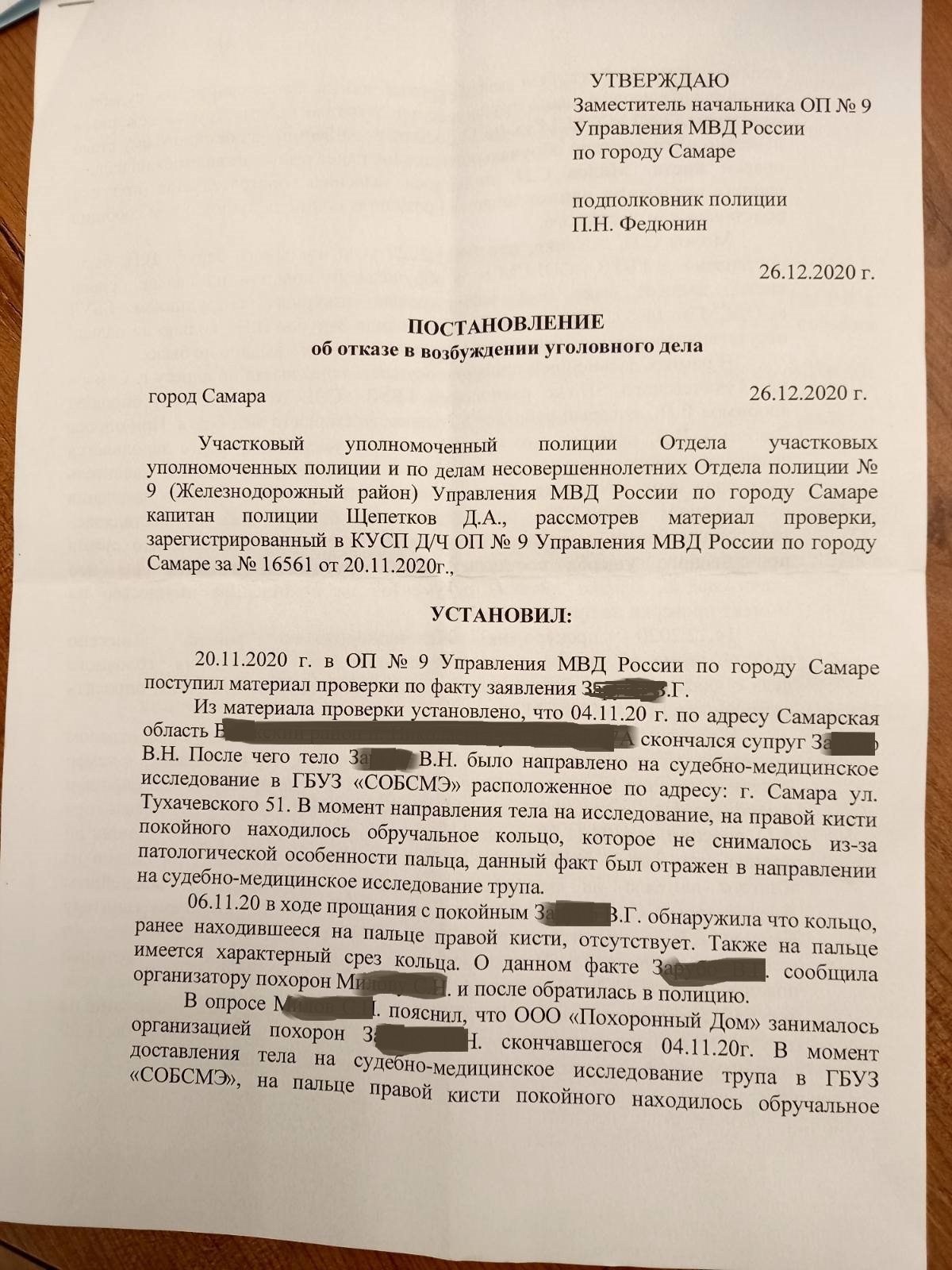 Когда оформляли документы о смерти, везде указали, что на руке остается обручальное кольцо.