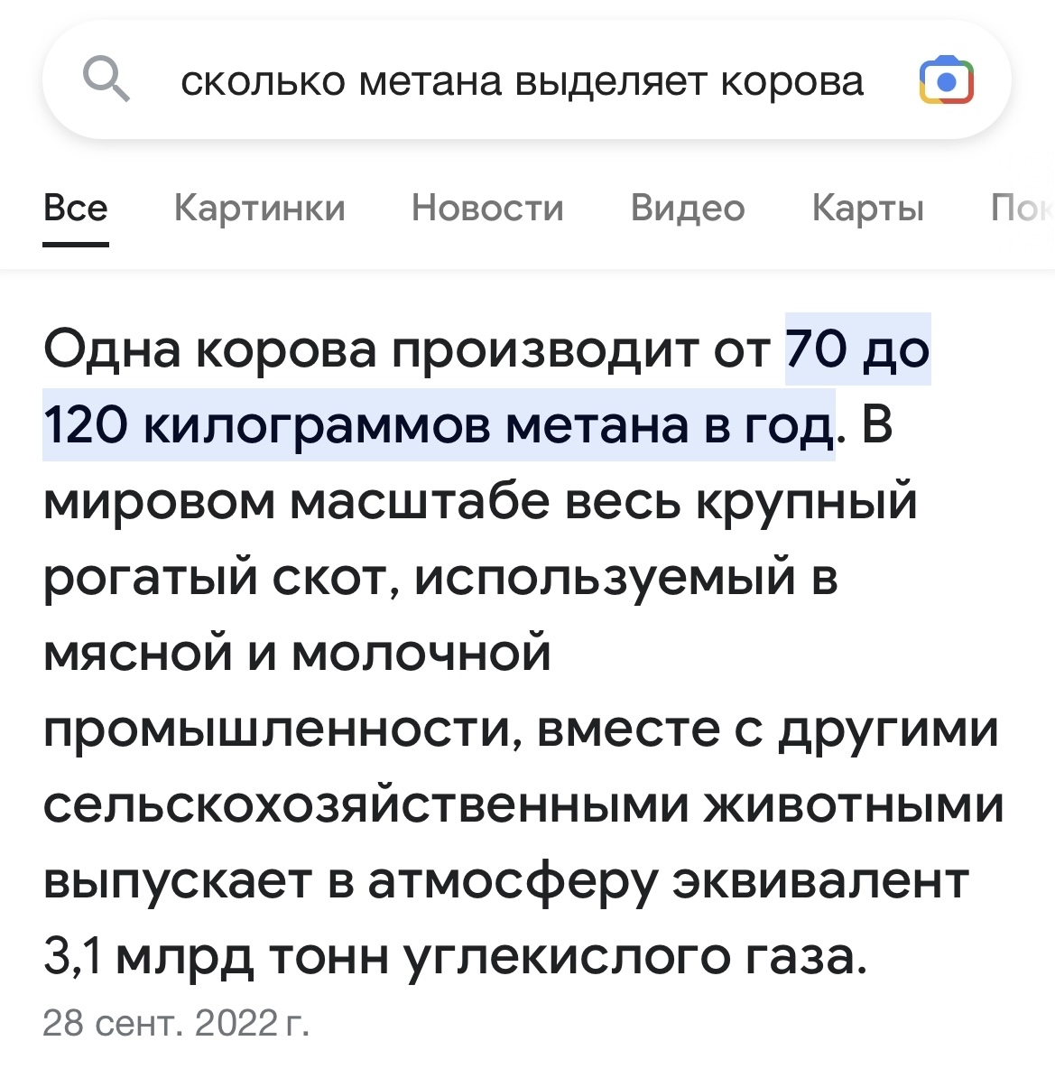 Так, коровы пукают, газообразным метаном и для перевода килограммов газа в объём, возьмем среднее значение выделяемого газа одной коровой 100кг в год.