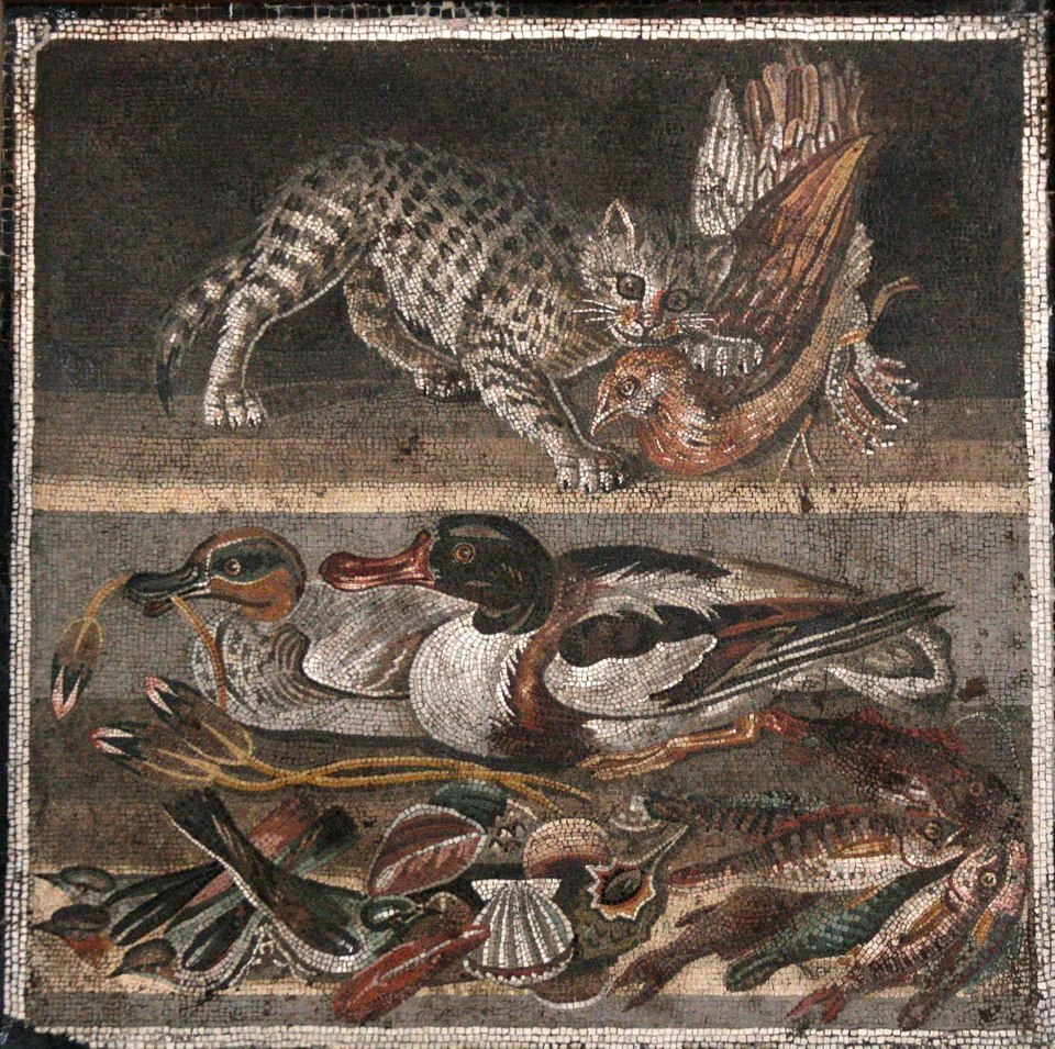 Римская мозаика из дома Фавна в Помпеи, здесь изображены котейка атакующая перепёлку и кормящиеся гуси.