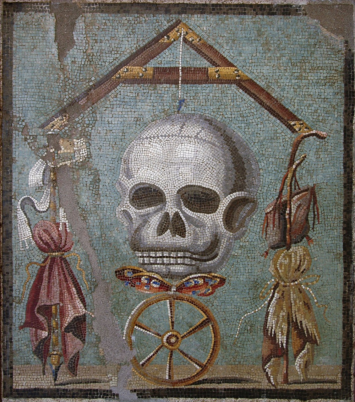 Известная многим мозаика из Помпеи «Memento Mori» является одним из самых поразительных по ясности аллегорических изображений. Тема имеет эллинистическое происхождение и представляет смерть как великого уравнителя, устраняющего все классовые и материальные различия. Слева и справа на плечах уровня подвешены и сохраняются смертью в идеальном балансе символы богатства и власти (скипетр и пурпурный плащ) и бедности (сума нищего и посох), что напоминает о мимолётной природе земных богатств.