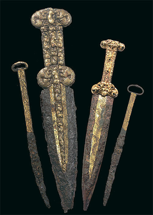 Скифские железные кинжалы и ножи с позолотой. 6-5 век до н.э. Из Скифского царского некрополя (Аржан-2), Тува, юг Сибири.