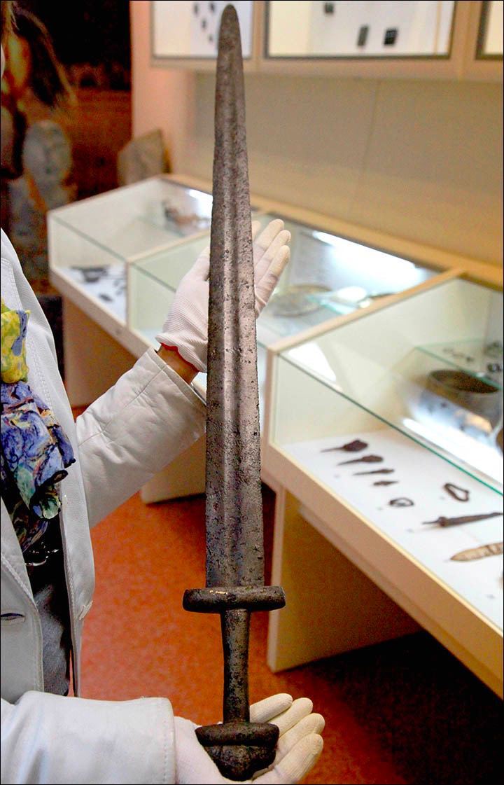 Меч сделанный в Германии в 12 веке и украшенный в Швеции, найденный в 1975 году под Новосибирском. Как он туда попал - неясно, но главная гипотеза заключается в том, что он стал подарком от Ивана Грозного одному из покорителей Сибири.