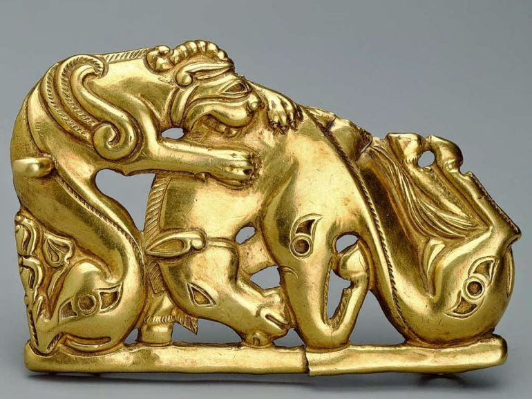 Скифская поясная пряжка из золота с изображением грифона, нападающего на лошадь. Найден в Сибири, V-IV вв. до н.э.