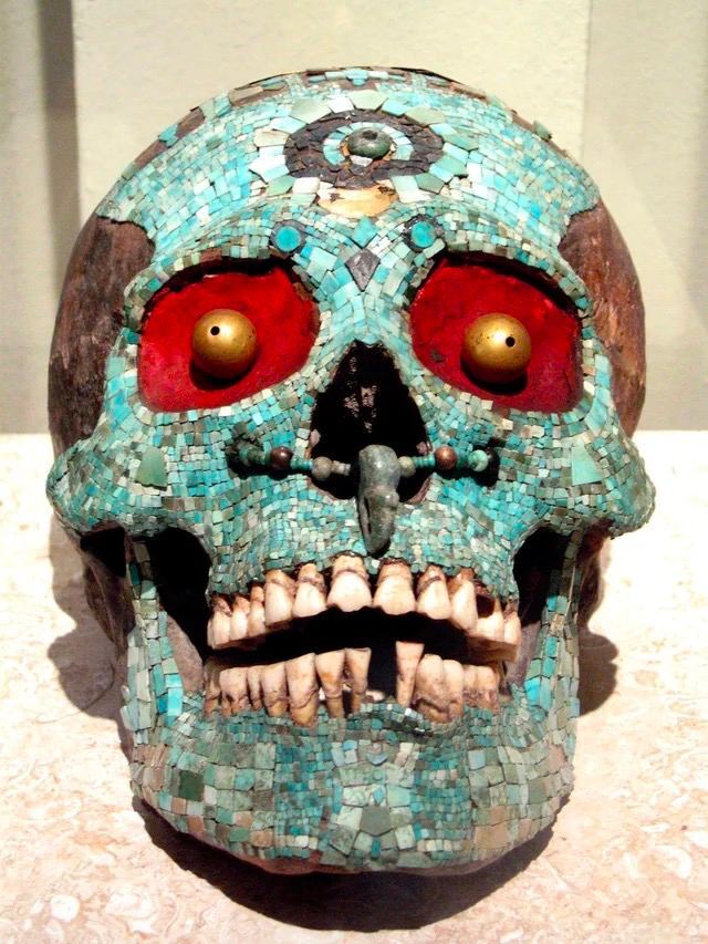 Череп ацтека из Тонала с золотыми глазами, нефритовым украшением на лбу и покрытый бирюзовой мозаикой.