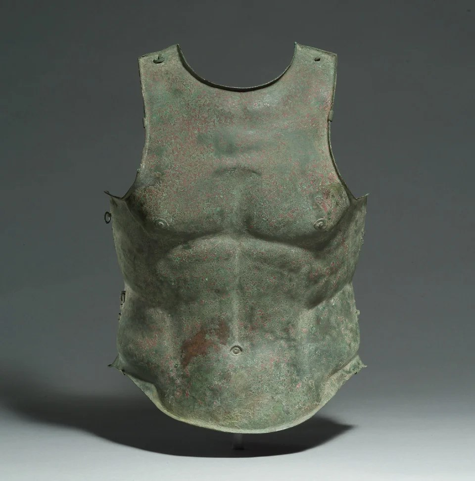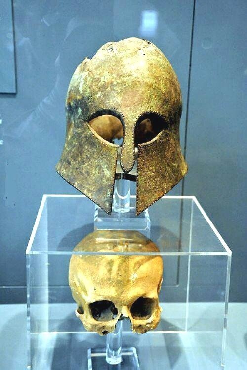 Коринфский шлем, найденный на месте битвы при Марафоне (490 г. до н.э.). Найден вместе черепом воина.