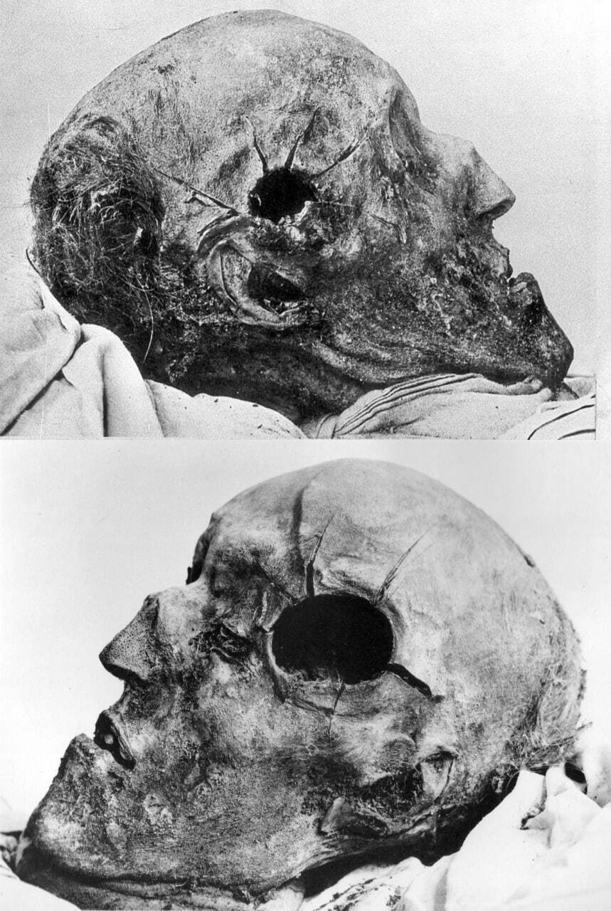 Останки, убитого стрелой 4700 лет назад. Мужчина 35-40 лет, найденный в болоте в 1946 году в Дании. Известно, что смертельной раной стала лишь вторая стрела, попавшая в грудь и пробившая аорту.