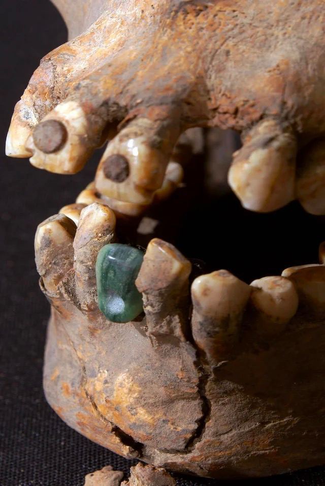 Верхние резцы женщины украшены круглыми камнями пирита. Такую технику практиковали в городах майя на юге Мексики, в Гватемале и Белизе.