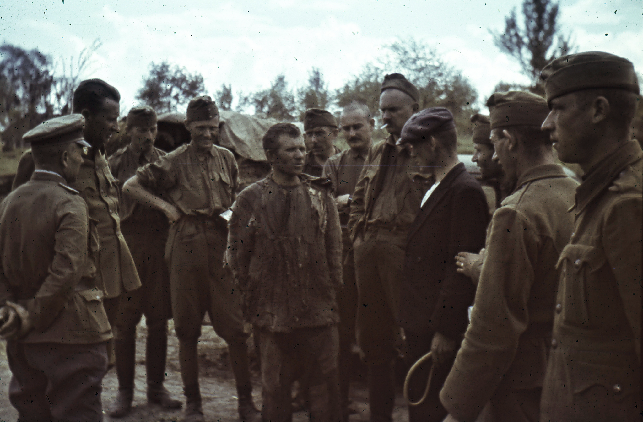 Венгерские солдаты ведут допрос советского военнопленного. Человек в кепке и черном пиджаке — предположительно полицай. Слева стоит офицер вермахта.