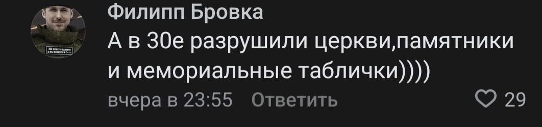 Филипп, секи, родился ты в 1895м, отца взвышего от несправедливости заводчика, затоптала солдотня в 1905м, на демонстрации. Мамка тебя в церковь ведёт, а поп говорит, смирение благодетель, ведь власть помазаника божьего от Бога, в 1907м сестру и брата лихоманка уносит, потому что докторов в "просвященной" России мало. Ведь помазаник божий, (по кошкам и воронам стреляет, ей Богу не вру, его же дневники), вместо того, чтоб об державе думать, а поп и говорит, то Боженька промысел свой правит, в лучшем мире теперь, дети Его! Хуякс в 12 лет стоишь по 16 часов у станка на заводе у частника и не было тогда ни тк ни тб, а штрафует дядя за всю хурму, живёшь в бараке, босой да нищий и желудок сводит от голода, а мать как свеча церковная от туберкулёза тает. Раз и 1914й, пездуй-бороздуй, в армию добро пожаловать! В армию которая испытывает патронный голод, да и просто голод, в армию которой управляют казнокрады и лжецы с трусами, да были и глыбы, кто солдат берег, да ворога срамил, но таких на перечёт. А поп полковой все елей разливает, как заживешь на том свете во имя идеалов чужих1!! А офицеры лощеные ходют, с ряхами сытыми , да плоточками губы промакивают, после салонов. И тут в твоей роте, раз, ячейка революционеров , кадетов, коммунистов, социалистов, анархистов да пох кого, кто говорит, не надо плохо жить, можно ведь и хорошо. Хуякс временное правительство, всё сыпется, все хапают, а жизнь твоя бурная меньше грязи стоит, которую месишь и офицеры с испугаными лицами, валят кто куда и тут гремящий октябрь, коммунисты и обещание порядка, тень порядка. Гражданская, голод и учёба, басмачи, страна которую раздирают интервенты и беззаконие, злость, боль и ненависть, каждый день, каждую гребаную секунду ты вспоминаешь попа, елей и ладан в тёмной часовенке. Идёшь на ускореные командирские курсы, видишь как народ в едином порыве, поверив и ощутив ветер свободы на лице, двигает науку, социальные институты и лифты, видишь закон, не без перегибов, но он есть! Видишь сытые лица и и как АНТ-20 бороздит небо. А потом видишь церковь, которая только царю подмахивала, да свой жирок берегла, раскулачиваешь да развенчиваешь, бьёшь питовранов которые всю жизнь тебе в лицо врали, наживались на таких как ты, да о себе думали, а не о пастве. Скажи честно, ты будешь храмы жалеть, памятники да таблички? Были и среди них люди, а были и среди коммунистов нелюди, но жиза чуть многогранней.