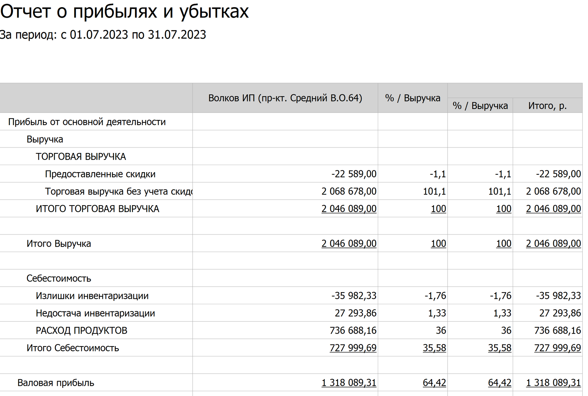 Начнём с количества продаж: мы сделали 5005 чеков на сумму 2.046.089 рублей за июль месяц, из которых 736.688,16 рублей ушло на расход продуктов, также 27.293,86 рублей на недостачу продуктов в той или иной степени, но они компенсировались частичными излишками.