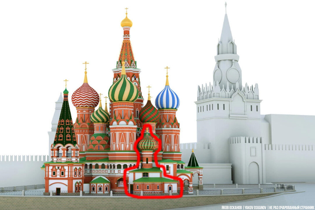 И только несколько десятилетий спустя сын Ивана Грозного повелел пристроить к собору ещё одну церковь и освятить её в честь местного юродивого Василия, которого похоронили возле стен здания. По легенде на могиле святого случалось много чудес и люди приходили поклоняться ему.