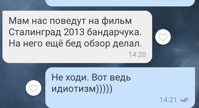 Пришло тут на выходных сообщение в чат класса, что в честь 80-летия окончания Сталинградской битвы весь поток восьмиклассников в парадной форме идет смотреть фильм "Сталинград" с последующим его обсуждением. Я похохотала над парадной формой, которую так ненавидит мой сын, а сын, поддержав шутку, юморнул, мол, надеюсь, это не тот фильм, на который Бэд обзор делал.