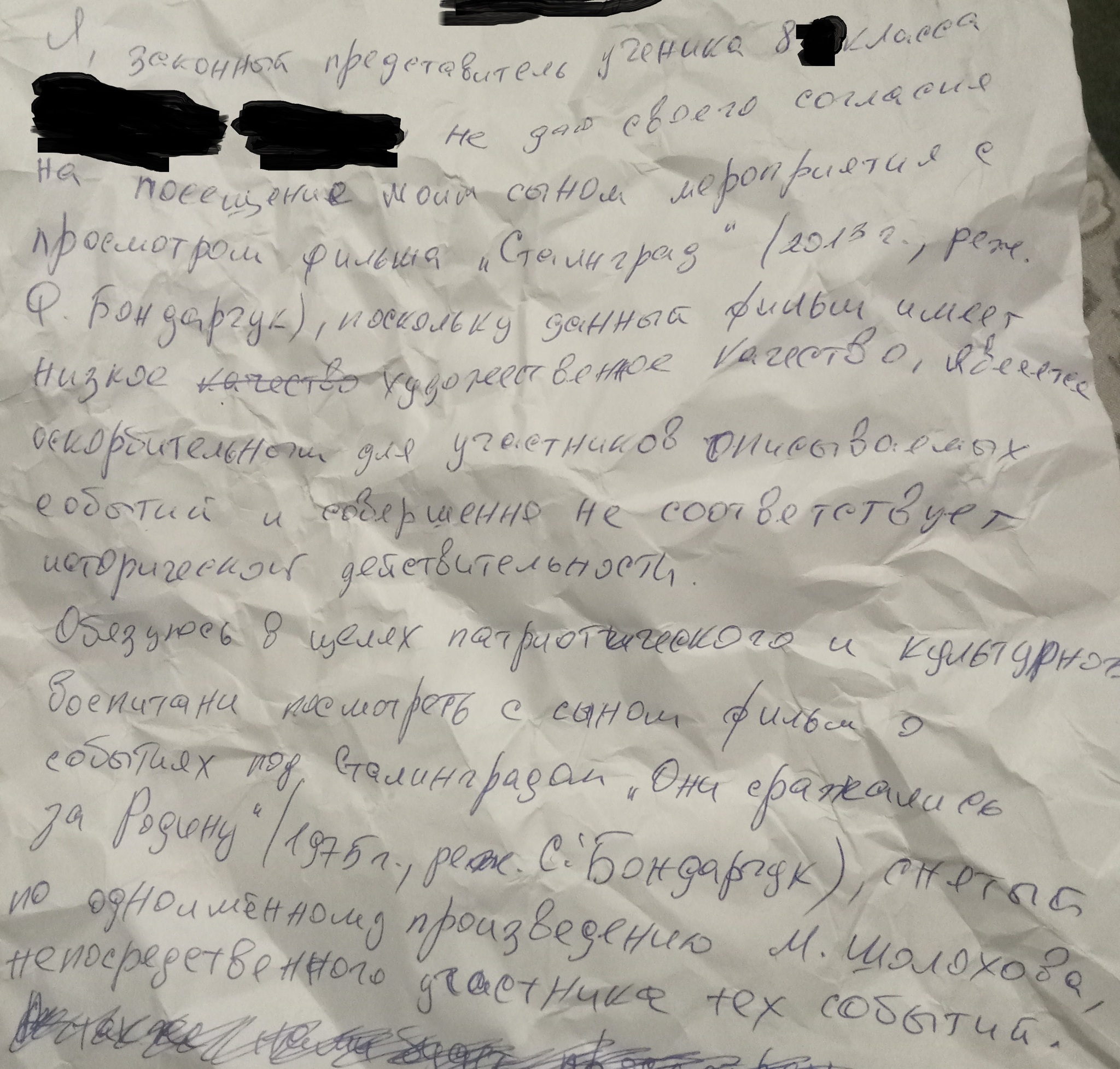 В случае конфронтации попросила ребёнка сообщить о моей готовности обсудить фильм про Сталинград 2013 года с классным руководителем, директором школы и Департаментом образования.