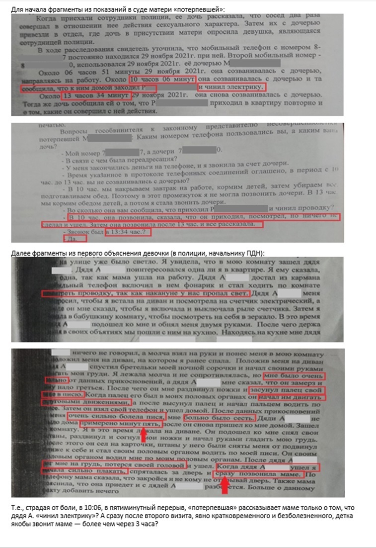 Прокурор «не заметил» признаков заведомо ложного доноса на стадии следствия, а ведь то, что «потерпевшая» сторона откровенно врёт, было понятно уже на следующий день после заявления о преступлении. Если 10-летняя детка рассказывает, что ей «в писю» совали палец и им там «двигали круговыми движениями», это было больно, а после этого было больно сидеть, а судмедэксперт на следующий день после совместного с гинекологом осмотра пишет, что никаких признаков телесных повреждений, в том числе в области половых органов, НЕ ОБНАРУЖЕНО (капслок эксперта), — то кто из них врёт? Только не отвечайте сразу, ибо ещё есть мнение 3 судей апелляционной инстанции: «Доводы осуждённого Р. об отсутствии следов насилия у потерпевшей …с учётом задержания Р. около 18.00, выводы суда под сомнение не ставят и на квалификацию его действий не влияют» (т.е. заросло за сутки?). Точно врёт не эксперт!