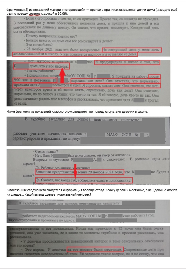 Другой свидетель, начальница матери «потерпевшей», рассказала в суде, что в день преступления мать «потерпевшей», узнав «то ли о домогательствах, то ли об изнасиловании» дочки, не домой поехала, а продолжила работать. Кроме того, свидетельница рассказала, что мать «потерпевшей» на следующий день (при переписке о выходе на работу) прислала ей сообщение странного содержания, из которого ей запомнились слова «всё закрутилось, игра началась», она даже зачитала его своим подчинённым. Единственное, не помнила, в каком мессенджере велась переписка. Суд направил запрос в БиЛайн, и поскольку эсмэска в тот период не регистрировалась, прокурор сделал вывод, что сообщения не было. А мессенджеры Вотсап и Вайбер даже не вспоминали! Получается, у мамани-то «потерпевшей» ещё и сообщник был, и он тоже спокойно спит!