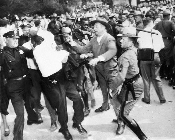 Тот мало того, что был черным, так ещё и имел наглость ездить в турне по СССР, рассказывая потом про дружелюбие коммунистов, и что у них даже рогов нет. В общем, пикскиллская общественность была крайне встревожена этим сходняком комми и, на всякий случай, взяв плакаты и палки, поехала пикетировать концерт. Перебрасывание оскорблениями быстро переросло в забрасывание камнями, и вспыхнули массовые драки. Полиция, вызванная следить за порядком, радостно включилась в происходящее, начав лупить черных дубинками. В камеры репортеров попали кадры, как полиция избивает пятидесятилетнего мужчину, награжденного героя двух войн Эжена Бюллара, будто бешеного пса. Один из ударов попал по глазам, и начались проблемы со зрением.